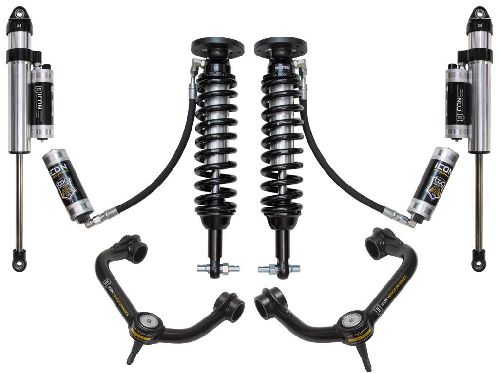 The ICON Vehicle Dynamics 2015-2020 Ford F150 2WD Stage 5 suspension system is the best choice for drivers looking to maximize the on and off-road potential of their trucks and will inspire confidence behind the wheel in nearly any situation. ICON engineers’ primary focus is to increase wheel travel and damping ability, which translates into outstanding vehicle control and ride quality both on and off-road. This system includes vehicle-specific tuned 2.5” coilover shocks featuring external remote reservoirs w/ CDCV for exceptional cooling properties and ICON-engineered Eibach coil springs for superior vehicle “feel” through the range of travel. These coilovers are also height adjustable from 1.75-3” of lift over stock allowing the use of larger, more aggressive wheel and tire combinations. Tubular upper control arms on the F150 not only add strength and durability, but help retain factory alignment spec range increasing caster over stock. ICON 2.5 Aluminum Series Piggyback rear shocks w/ CDCV utilize a vehicle-specific valving that balances the performance of the truck from front to rear. 2.5" CDC reservoir front and rear shocks ensure optimum performance by increasing the duration of consistent damping regardless of situation, keeping the shocks at a cooler operating temperature during heavy use. ICON's CDC Valve upgrade is included in this stage front and rear for those desiring an easy way to tune the ride externally with 10 settings from soft to hard.