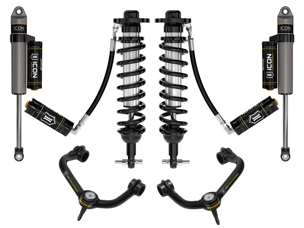 The ICON Vehicle Dynamics 2021 Ford F150 2WD Stage 4 suspension system is the best choice for drivers looking to maximize the on and off-road potential of their trucks and will inspire confidence behind the wheel in nearly any situation. ICON engineers’ primary focus is to increase wheel travel and damping ability, which translates into outstanding vehicle control and ride quality both on and off-road. This system includes vehicle-specific tuned 2.5” coilover shocks featuring an external remote reservoir for exceptional cooling properties and ICON-engineered Eibach coil springs for superior vehicle “feel” through the range of travel. These coilovers are also height adjustable from 0-3” of lift over stock, allowing the use of larger, more aggressive wheel and tire combinations. Tubular upper control arms on the F150 not only add strength and durability, but help retain factory alignment spec range increasing caster over stock. ICON 2.5 Series Aluminum Piggyback rear shocks utilize a vehicle-specific valving that balances the performance of the truck from front to rear. 2.5" reservoir shocks front and rear ensure optimum performance by increasing the duration of consistent damping regardless of situation, keeping the shocks at a cooler operating temperature during extended off-road use. The ICON Vehicle Dynamics 2021 F150 2WD Stage 4 suspension system is an excellent choice for those drivers looking to enhance the capabilities of their pickup on the road as well as in the dirt.