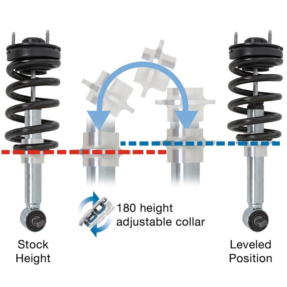 - Option of raising the front of their vehicle up to 2.75" (depending upon application) to clear larger tires or to keep the vehicle at stock height