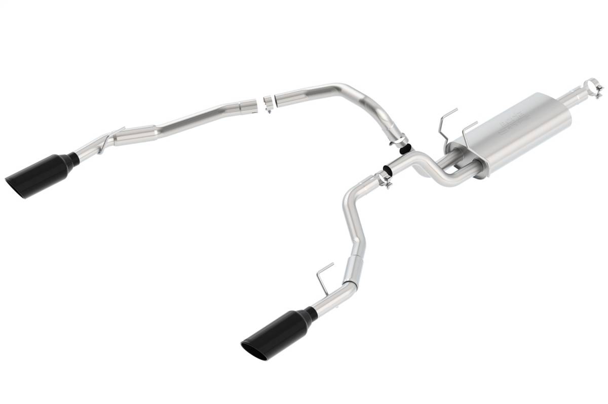 Fits through the factory bumper cut-outs (bumper has notches on the bottom). This system features a Black Chrome finish on T-304 stainless steel tips. Using BORLA(r) Stainless Steel Polish p# 21461 is NOT recommended with these black chrome tips. We suggest cleaning the tips with hot water and a microfiber cloth. BORLA(r) Cat-Back(tm) & Axle-Back exhaust systems feature patented straight-through and multi-core technology to unleash hidden horsepower. Increased exhaust velocity adds power, driving excitement, fuel economy, and the distinctive BORLA(r) Sound of Power respected by motoring enthusiasts everywhere. Each system is built from premium, high-quality T-304 austenitic stainless steel, superior to T-400 series knockoffs (such as 409), to give you the absolute best in performance and durability. Ultra-smooth mandrel bends ensure maximum flow & power, and precision computer numerical control (CNC) manufacturing ensures an accurate fit. Best of all, BORLA(r) stands behind every system with a Million-Mile Warranty. Just what you'd expect from the world's most experienced (and most winning) exhaust brand.