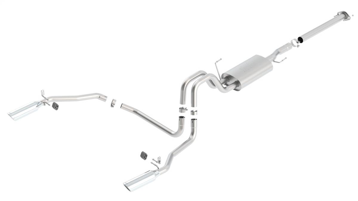 Features bright chrome on T-304 stainless steel tips. System can also be used on Crew Cab Standard Bed (78.8") vehicles but requires 60554 Adapter. Borla Cat-Back & Axle-Back multi-core technology is designed to unleash hidden horsepower. Increased exhaust velocity adds power, driving excitement, fuel economy, and the distinctive Borla Sound of Power respected by motoring enthusiasts everywhere. Each system is built from premium T-304 stainless steel, superior to T-400 series knockoffs (such as 409), to give you the absolute best in performance and durability. Ultra-smooth mandrel bends ensure maximum flow & power, and precision computer-controlled CNC manufacturing ensures an accurate fit. Best of all, Borla stands behind every system with a Million-Mile Warranty. Just what you?d expect from the world?s most experienced (and most winning) exhaust brand.