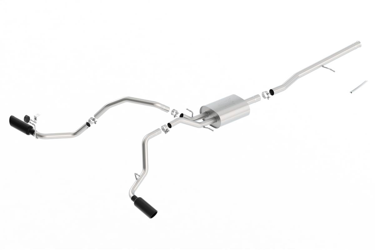 This system features a black chrome finish on T-304 stainless steel tips. Using Borla Stainless Steel Polish p# 21461 is NOT recommended with these black chrome tips. We suggest cleaning the tips with hot water and a microfiber cloth. Borla Cat-Back Axle-Back exhaust systems feature patented straight-through and multi-core technology designed to unleash hidden horsepower. Increased exhaust velocity adds power, driving excitement, fuel economy, and the distinctive Borla Sound of Power respected by motoring enthusiasts everywhere. Each system is built from premium T-304 stainless steel, superior to T-400 series knockoffs (such as 409), to give you the absolute best in performance and durability. Ultra-smooth mandrel bends ensure maximum flow & power, and precision computer-controlled CNC manufacturing ensures an accurate fit. Best of all, Borla stands behind every system with a Million-Mile Warranty. Just what you'd expect from the world's most experienced (and most winning) exhaust brand.