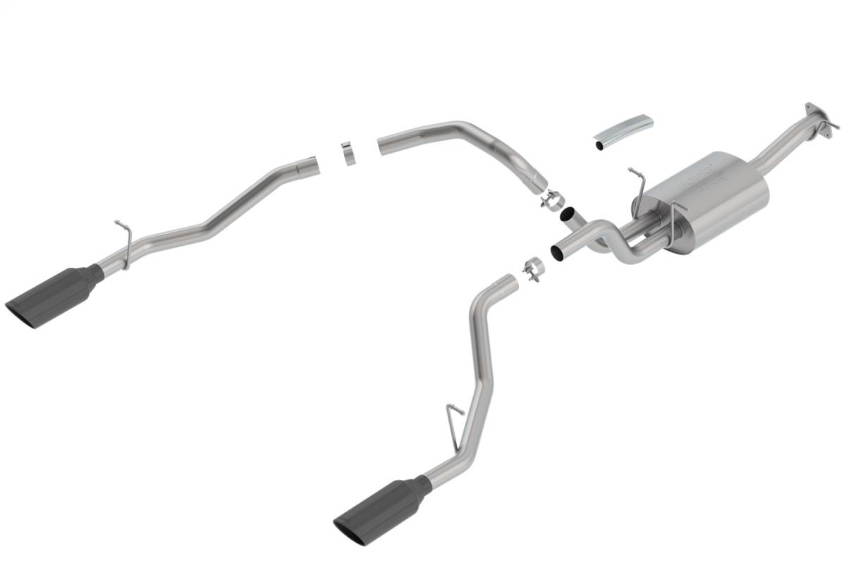 Fits through the factory bumper cut-outs. Includes the Rebel. Does NOT fit Ram Classic. This system features a Black Chrome finish on T-304 stainless steel tips. Using BORLA(r) Stainless Steel Polish p# 21461 is NOT recommended with these black chrome tips. We suggest cleaning the tips with hot water and a microfiber cloth. BORLA(r) Cat-Back(tm) and Axle-Back exhaust systems feature patented straight-through and multi-core technology designed to unleash hidden horsepower. Increased exhaust velocity adds power, driving excitement, fuel economy, and the distinctive BORLA(r) Sound of Power respected by motoring enthusiasts everywhere. Each system is built from premium, high-quality T-304 austenitic stainless steel, superior to T-400 series knockoffs (such as 409), to give you the absolute best in performance and durability. Ultra-smooth mandrel bends ensure maximum flow&power, and precision computer numerical control (CNC) manufacturing ensures an accurate fit. Optional resonator 60667 can be added to the system to dampen the sound level. Best of all, BORLA(r) stands behind every system with a Million-Mile Warranty. Just what you'd expect from the world's most experienced (and most winning) exhaust brand.