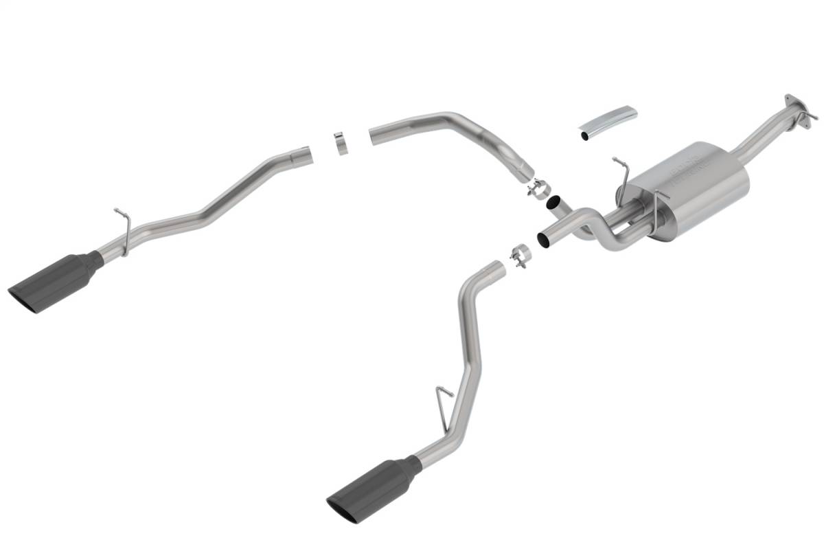 Fits through the factory bumper cut-outs. Includes the Rebel. Does NOT fit Ram Classic. This system features a Black Chrome finish on T-304 stainless steel tips. Using BORLA(r) Stainless Steel Polish p# 21461 is NOT recommended with these black chrome tips. We suggest cleaning the tips with hot water and a microfiber cloth. BORLA(r) Cat-Back(tm) and Axle-Back exhaust systems feature patented straight-through and multi-core technology designed to unleash hidden horsepower. Increased exhaust velocity adds power, driving excitement, fuel economy, and the distinctive BORLA(r) Sound of Power respected by motoring enthusiasts everywhere. Each system is built from premium high-quality T-304 austenitic stainless steel, superior to T-400 series knockoffs (such as 409), to give you the absolute best in performance and durability. Ultra-smooth mandrel bends ensure maximum flow& power, and precision computer numerical control (CNC) manufacturing ensures an accurate fit. Optional resonator 60667 can be added to the system to dampen the sound level. Best of all, BORLA(r) stands behind every system with a Million-Mile Warranty. Just what you'd expect from the world's most experienced (and most winning) exhaust brand.