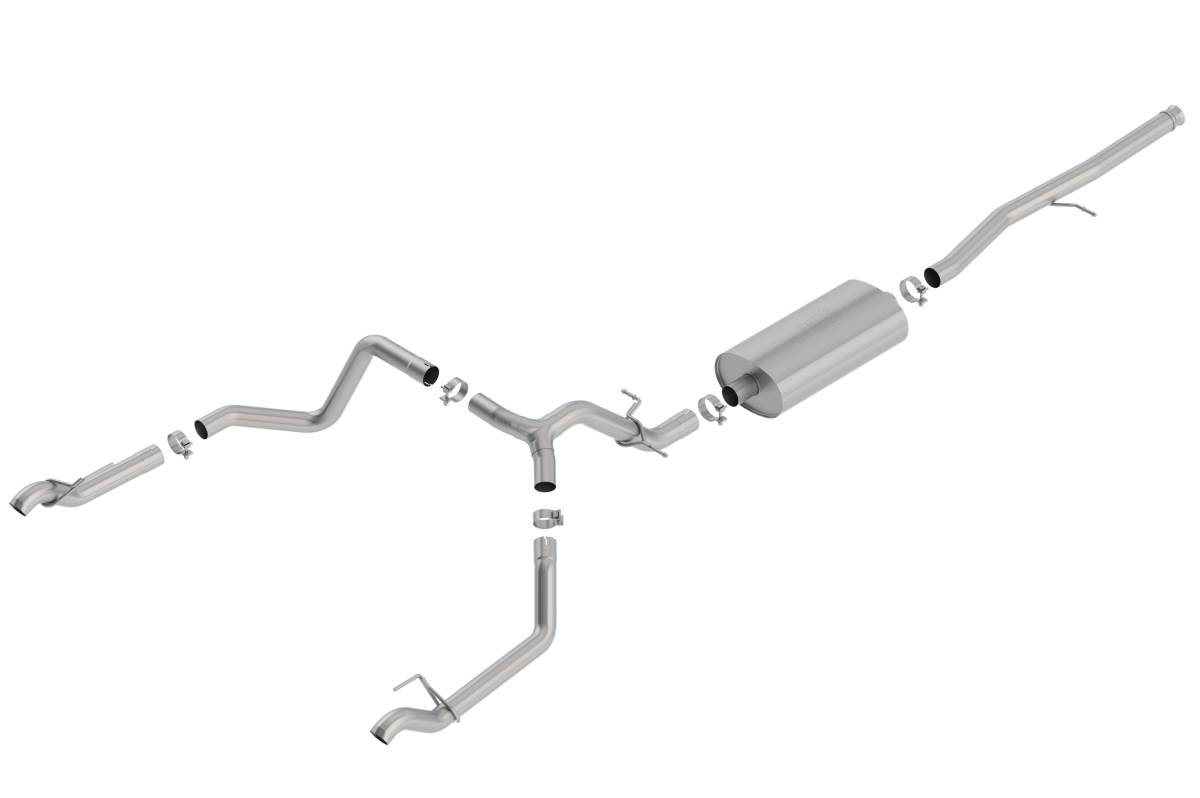 Factory Split Rear Exit vehicles ONLY. Tips NOT included. Use factory tips. Add Adapter 60708 for Crew Cab with Standard Bed (6' 7") 157" Wheelbase vehicles. BORLA(r) Cat-Back(tm) and Axle-Back exhaust systems feature patented straight-through and multi-core technology designed to unleash hidden horsepower. Increased exhaust velocity adds power, driving excitement, fuel economy, and the distinctive BORLA(r) Sound of Power respected by motoring enthusiasts everywhere. Each system is built from premium T-304 stainless steel, superior to T-400 series knockoffs (such as 409), to give you the absolute best in performance and durability. Ultra-smooth mandrel bends ensure maximum flow& power, and precision computer numerical control (CNC) manufacturing ensures an accurate fit. Best of all, BORLA(r) stands behind every system with a Million-Mile Warranty. Just what you'd expect from the world's most experienced (and most winning) exhaust brand.