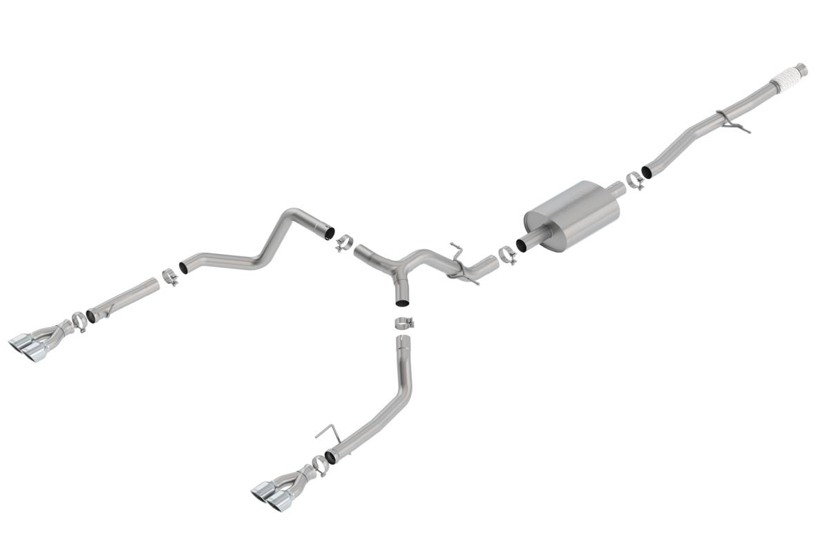 Factory Split Rear Exit ONLY. This system features bright chrome on T-304 stainless steel tips. Add Adapter 60708 for Crew Cab with Standard Bed (6' 7") 157" Wheelbase vehicles. BORLA(r) Cat-Back(tm) & Axle-Back exhaust systems feature patented straight-through and multi-core technology designed to unleash hidden horsepower. Increased exhaust velocity adds power, driving excitement, fuel economy, and the distinctive BORLA(r) Sound of Power respected by motoring enthusiasts everywhere. Each system is built from premium T-304 stainless steel, superior to T-400 series knockoffs (such as 409), to give you the absolute best in performance and durability. Ultra-smooth mandrel bends ensure maximum flow & power, and precision computer numerical control (CNC) manufacturing ensures an accurate fit. Best of all, BORLA(r) stands behind every system with a Million-Mile Warranty. Just what you'd expect from the world's most experienced (and most winning) exhaust brand.