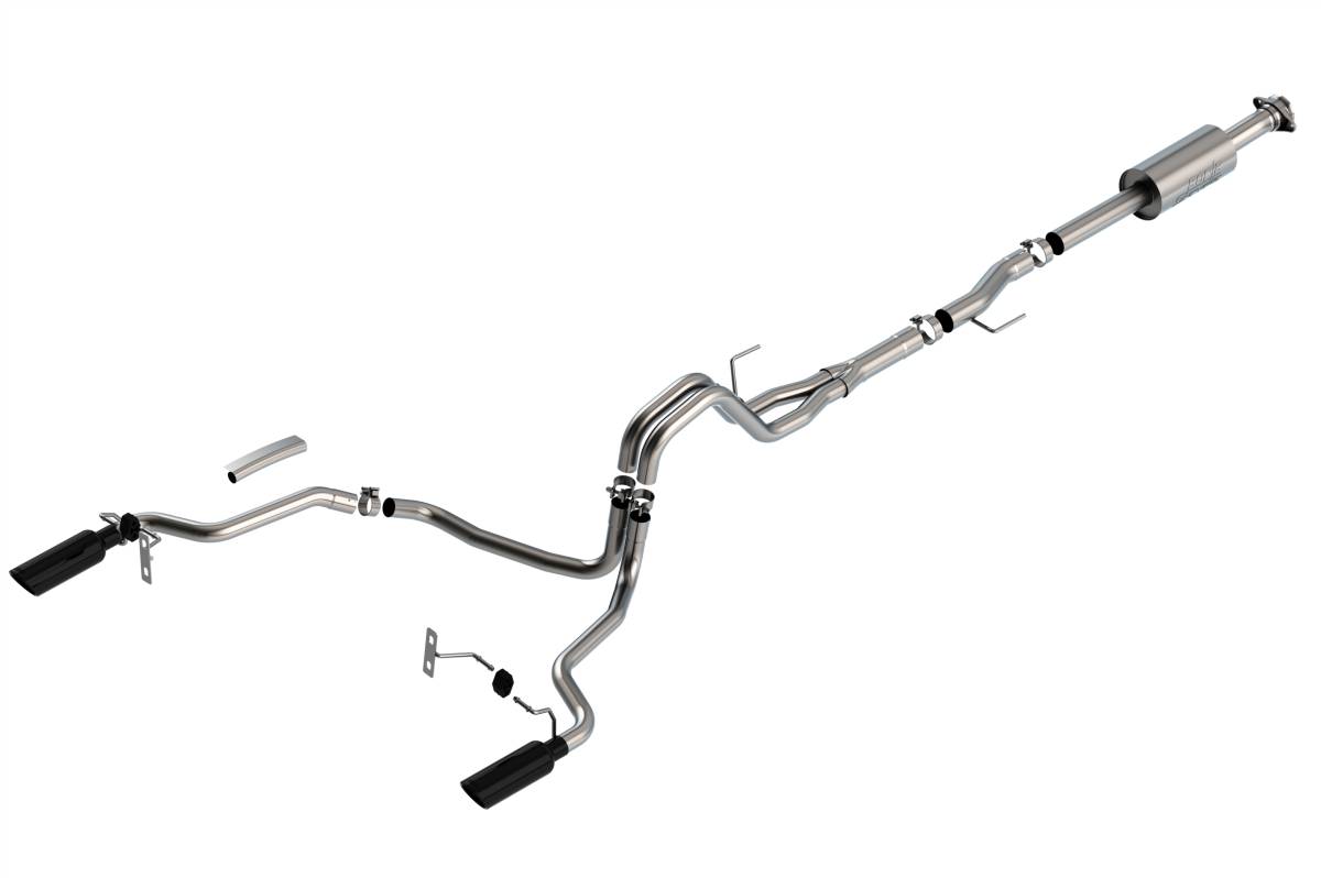 The BORLA(r) Cat-Back(tm) system 140863BC was specifically designed to enhance the power and sound of the Ford F-150 equipped with 2.7L and 3.5L Engines. EXCEPT 3.5L PowerBoost and Tremor models. It includes black chromed T-304 stainless steel tips and a split rear exit configuration. Using BORLA(r) Stainless Steel Polish p# 21461 is NOT recommended with these black chrome tips. We suggest cleaning the tips with hot water and a microfiber cloth. The entire system is made of T-304 stainless steel and utilizes computer numerical control (CNC) manufacturing techniques that ensure an accurate fit. This system features the "S-Type" sound that gives you an aggressive sound with no drone. It is also available with bright chromed tips (part number 140863). There are also systems available for the 2.7L and 3.5L F-150 that offer different options for sound level, tip finish and tip Exits. Add Adapter 60556 for Crew Cab with Standard Bed (157.2") Wheelbase vehicles. Add Adapter 60564 for Extended Cab with Long Bed (164.1") Wheelbase vehicles. All this is backed by our unsurpassed Million Mile Warranty., System Features:, Cat-Back(tm) System, Split Rear Exit, Black Chrome On T-304 Stainless Steel Tips, S-Type Sound Level, T-304 Stainless Steel Construction, Bolt-On Installation, Million Mile Warranty