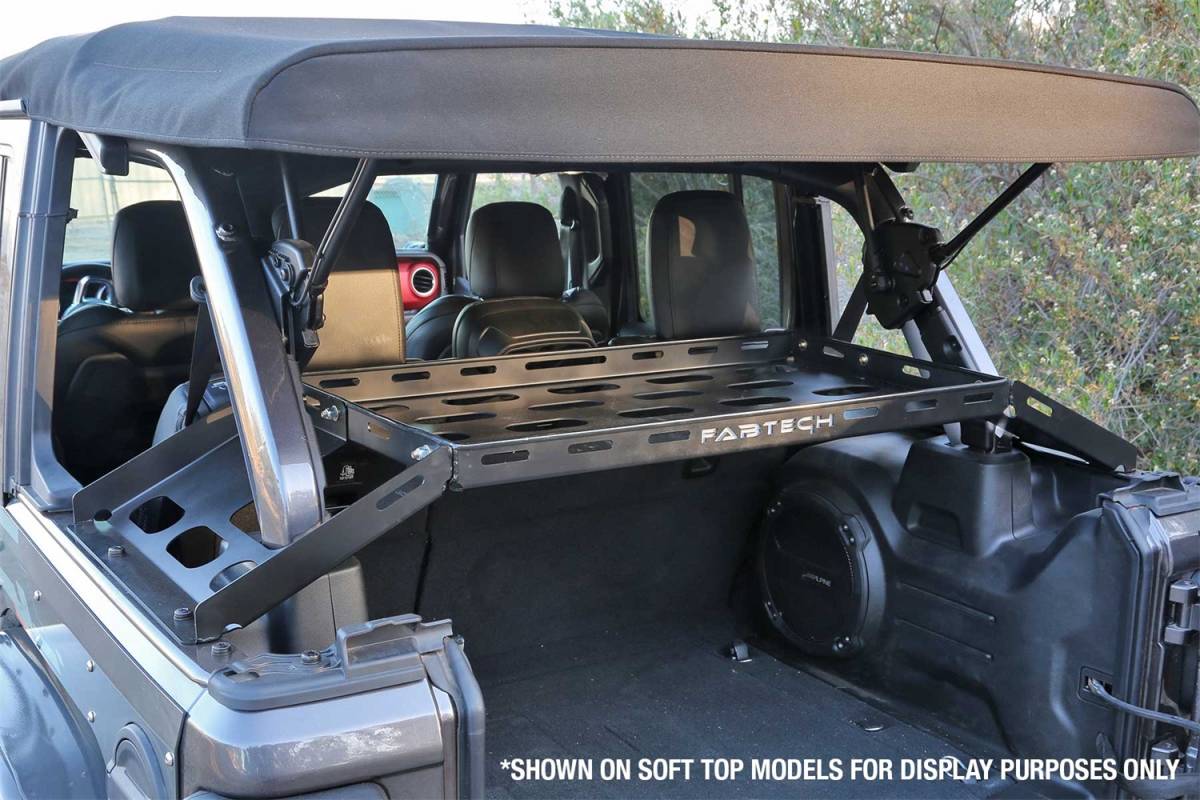 This all steel heavy duty Cargo Rack is perfect for increasing the interior carrying capabilities of the Jeep JL. The rack is located behind the rear seat creating a double deck storage area. The deck area of the rack is 22 inches above the floor and provides an additional 4 1/2 square feet of flat storage space. The three-piece design is constructed of steel plate that bolts to existing interior holes for an easy no drill installation. The rack provides a cargo carrying capacity of 150lbs. with rattle free operation. Multiple slotted holes on the perimeter of the cargo rack tray allow the use of tie down straps, bungee hooks or rope to properly secure cargo. This rack has been thoroughly tested in rugged offroad conditions and is finished in tactical black powdercoat with edge molding to prevent abrasions while accessing cargo.