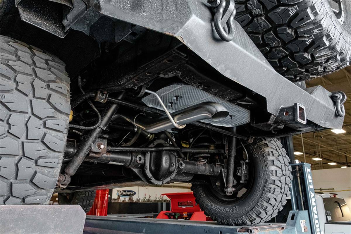 The CORSA Performance Jeep Wrangler JKU catback exhaust system features CORSA's Patented Reflective Sound Cancellation(R) (RSC) Technology allows acoustic engineers to create an aggressive drone free exhaust note, styled specifically to fit the personality of your vehicle. This catback exhaust system moves the muffler to the center of the vehicle providing for better clearance and maximum approach angles for offroad driving. CORSA's full catback exhaust allowed our acoustic engineers to get added deep tonality from the V6 engine creating and AGGRESSIVE V8 LIKE SOUND under acceleration while maintaininig a DRONE-FREE EXPERIENCE during cruise. Choose from 4 unique tip options: Dump-style for maximum offroad clearance, polished, black or our American Flag option. Performance gains are not affected by sound choice.