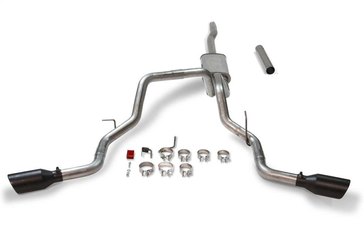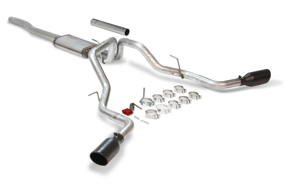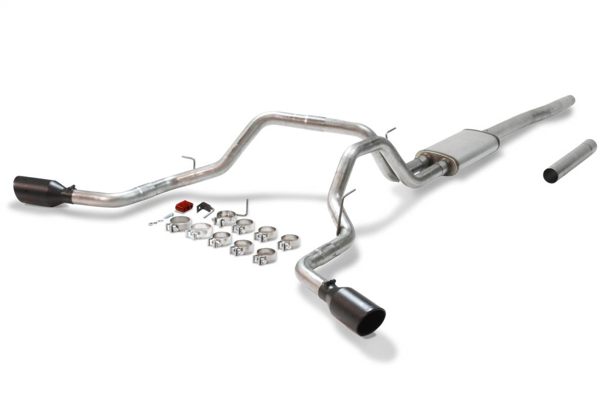 Flowmaster's FlowFX Cat-back exhaust system is designed for 2004-08 Ford F-150 trucks with 4.6L and 5.4L V8 engines. This bolt-on system is manufactured using durable 409 stainless steel throughout, and features a 3.00-inch inlet pipe leading to a single inlet/dual outlet FlowFX straight-through muffler for a deep, moderately aggressive sound and maximum performance. The dual 2.50-inch mandrel-bent tailpipes are custom routed to clear the factory spare tire and tow hitch without any clearance issues and exit out the sides behind the rear tires, which is ideal when towing so you don't blow exhaust fumes on your boat, vehicle or trailer. The system is then finished off with a pair of large 4.50-inch black ceramic coated stainless steel tips, giving your F-150 an aggressive look to go with the sound of the FlowFX performance muffler. This system utilizes the factory hanger locations and includes detailed instructions and all necessary hardware for an easy at home installation.