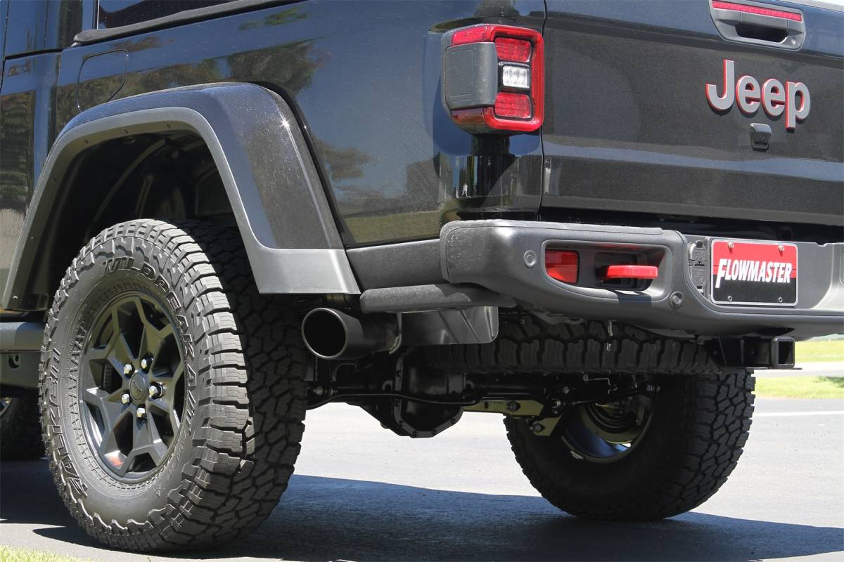 Introducing the new FlowFX(TM) cat-back exhaust system for the 2020 Jeep Gladiator with 3.6L engine. This stainless steel performance exhaust system starts with large 3-inch mandrel-bent tubing flowing into the FlowFX "straight-through" performance muffler. The mandrel-bent tailpipe exits behind the passenger side rear tire and is finished off with a large 4.50-inch black ceramic coated exhaust tip embossed with the Flowmaster(R) name. This system creates a deep powerful sound outside the vehicle with a moderate tone inside the cab and utilizes the factory hanger locations. Includes all necessary parts, hardware and detailed instructions for an easy installation you can do at home.