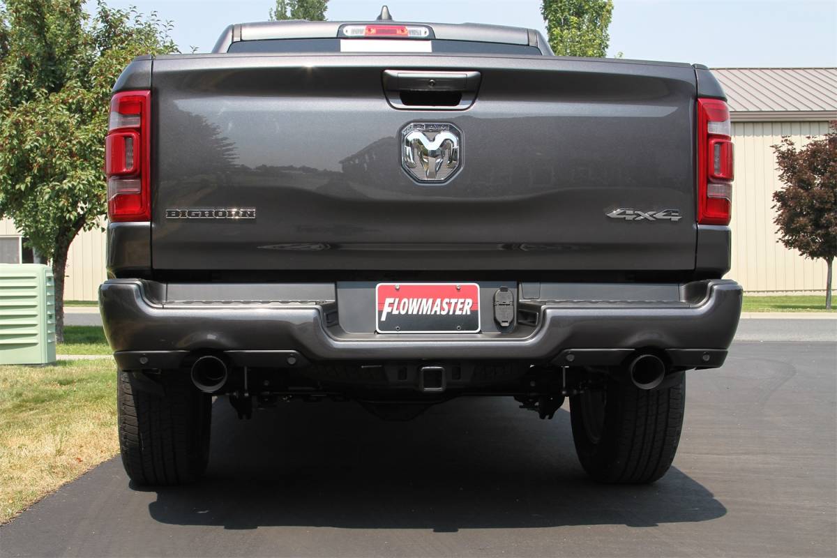 Flowmaster's American Thunder Cat-back exhaust system for the 2019 Ram 1500 Trucks with 5.7L V8 Gas Engine and Factory Dual Tailpipes is perfect for the person looking for an aggressive exterior sound level with all of the performance benefits that you would expect from Flowmaster. This bolt-on 409S stainless steel system features a single 3.00 inch mandrel-bent front pipe leading into a 50 series HD muffler for maximum power and exterior sound quality, but with a moderate and pleasant interior tone at cruising speeds. Other features include dual 3.00 inch tailpipes finished with 4.00 inch black ceramic coated exhaust tips. This system includes all necessary parts, hardware and instructions for an easy installation.