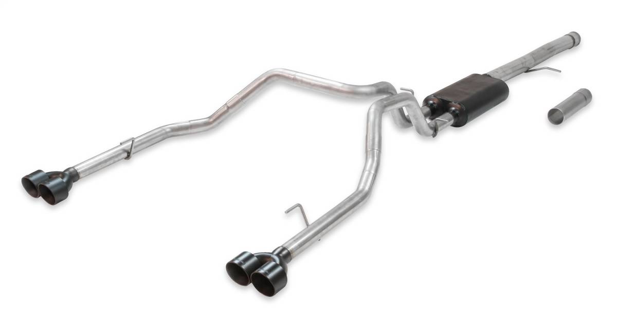 Flowmaster's American Thunder cat-back dual exhaust system for the 2019 GM Silverado/Sierra 1500 (new body style) trucks with the 6.2L engine is perfect for the person looking for an aggressive sound level outside the truck, with a moderate interior tone and all the performance benefits you would expect from Flowmaster. This emissions-legal bolt-on system fits all 6.2L Crew Cab with 5.5-ft and 6.5-ft beds, and all Double Cab with a 6.5-ft bed with factory dual exhaust. Features include a mandrel-bent 3.50-inch stainless steel inlet tube flowing into a single 50 Series HD muffler, dual 2.50-inch mandrel-bent stainless tailpipes replacing the factory resonators and giving your truck some growl. The tailpipes are finished off with quad 4.00-inch black ceramic coated stainless steel tips that exit in place of the factory bolt-on trim bezels giving your truck an aggressive performance style and setting your truck apart from others, sending the message that you would rather lead than follow. Designed for an easy fit, this system includes all necessary parts, detailed instructions and hardware for an easy at home installation. Notes: Fits 147" and 157" wheelbases with 6.2L and Factory Dual Exhaust.