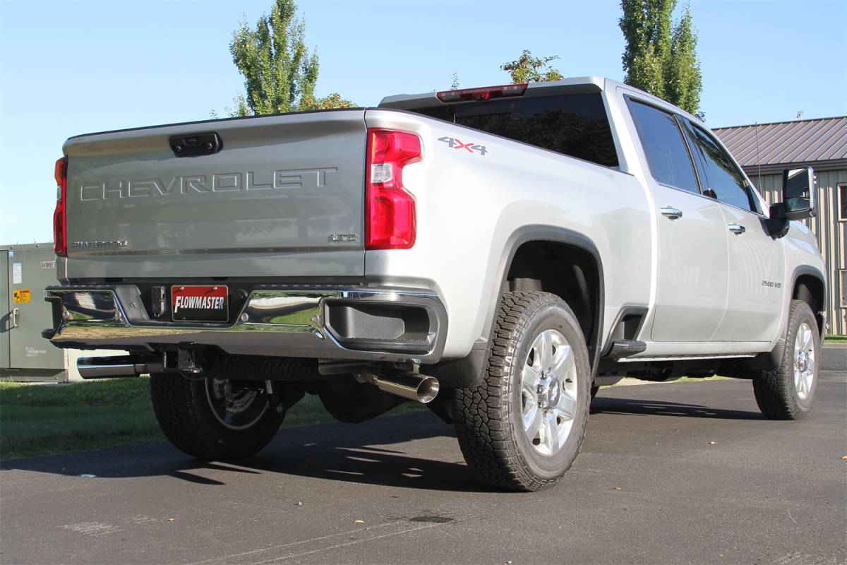 The Flowmaster(R) American Thunder(R) Cat-back exhaust system for the 2020 Chevy Silverado and GMC Sierra 2500HD/3500HD trucks with the 6.6L gas engine, is perfect if you are looking for a moderate to aggressive sound level inside and outside of the truck, with all of the performance benefits that you would expect from Flowmaster(R) Designed for the Crew Cab, Standard Bed (6.5 ft.) models only, this bolt-on, emisisons-legal system features a stainless steel 50 Series HD(TM) muffler and large dual 3.00-inch 409 stainless steel mandrel-bent tailpipes that can be configured to exit either dual straight out the back, or dual out the sides behind the rear wheels which is best suited for towing applications. The system is finished off with polished 4.00-inch stainless steel tips and is covered by our Lifetime Limited Warranty. Designed for an easy fit, this system includes all necessary parts and hardware for installation.