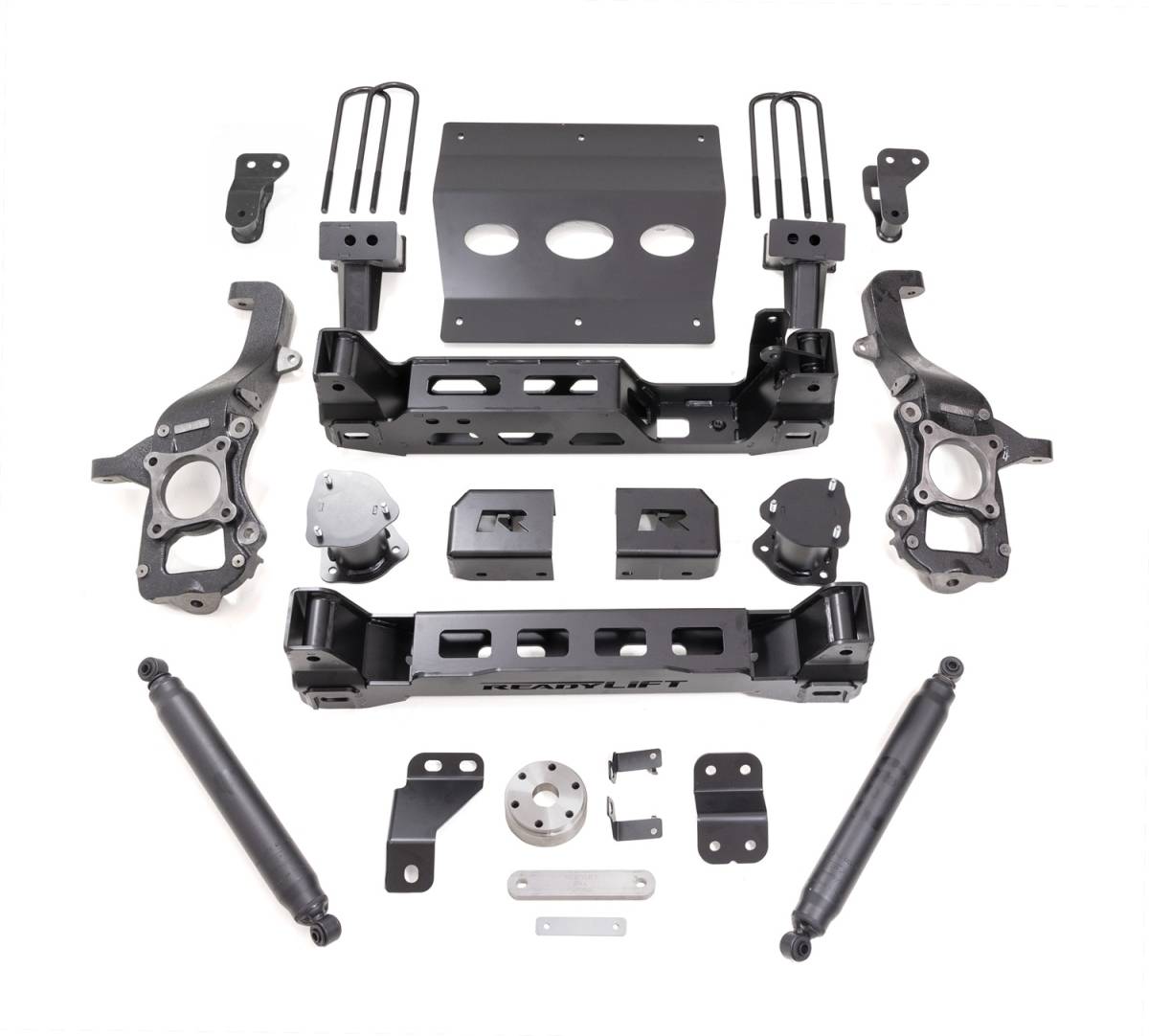 ReadyLIFT 6" Lift Kit is developed to give F-150 owners a complete big lift option that lifts the front of the vehicle 6" giving the rear a neutral stance. The all-new Ford F-150 4WD 6" Big Lift Kit is available in three shock configurations depending on customer ride, handling, and comfort needs. The base kit delivers 6-inches of lift coupled with our twin tube ReadyLIFT SST3000 performance rear shock – SKU 44-21600. For customers seeking the ultimate in comfort and ride control, ReadyLIFT offers our industry-exclusive Falcon 1.1 Monotube performance rear shock – SKU 44-21620. Finally, ReadyLIFT will be launching a Continuously Controlled Damping (CCD) adaptive suspension compatible 6" kit (SKU coming soon) – this CCD compatible kit retains the factory electronic shocks via precision-engineered shock extensions. The new ReadyLIFT Ford F-150 6" kits are equipped with heavy-duty 1/4" steel plate construction front and rear crossmembers that offer unmatched strength for all driving conditions. Featuring a set of durable lifted knuckles and strut spacers, you gain enough ride height to run up to 35-inch tires with the right wheel! The new 6" systems include everything necessary to correct suspension, steering, and driveline geometry to maintain on-road handling while improving strength and offroad capability. Fabricated steel 4 " tall rear block offers the correct amount of rear lift while the factory-style U-bolts aid in ease of installation.