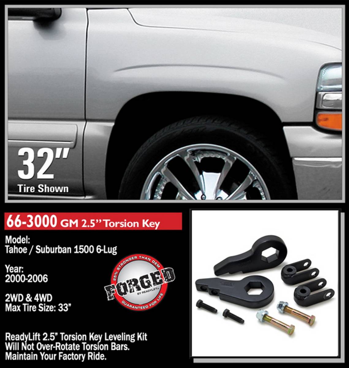 ReadyLift leveling kits are the fastest, safest, least expensive way to bring the front of a vehicle level with the rear. Our torsion keys are designed to grab the FLAT of the torsion bar for a tighter, sturdier fit. CNC machined adjuster bolt pockets and 10.9 grade metric hardware allow for proper bolt seating, ensuring an accurate and safe adjustment. Only ReadyLift torsion keys are forged, making them 25 percent stronger than OEM and primed to last the life of your vehicle. ReadyLift keys are guaranteed never to affect the OEM ride and will not add more pressure on the stock suspension components. Through our innovative engineering, ReadyLift kits cost thousands less than a traditional lift kit and install in about 1-2 hours. ReadyLift Lifetime Warranty Included! All ReadyLift products are backed by a lifetime warranty for as long as you own your vehicle and includes all necessary parts, hardware, detailed installation instructions, and two color decals.
