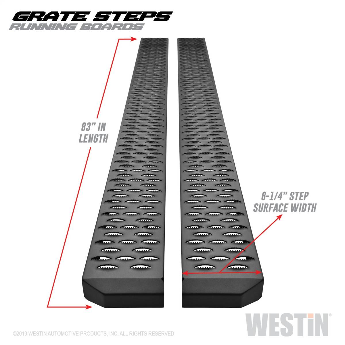Westins Grate Steps Running Boards are engineered to provide maximum traction without sacrificing style. The 6 1/4" step surface width features an aggressive 1/4" high punched tread allowing traction in any weather condition. The unique serrated edges help clean dirt, snow and mud off your boots to keep truck cab clean. Grate Steps Running Boards feature stylishly formed and fully welded ends with a custom die-cast riveted logo badge. E-coated base coat provides long lasting corrosion protection which far surpasses that of the competition. Solid 1-piece construction makes the Grate Steps Running Boards ideal for construction, commercial, vans and utility use. Available in universal lengths (54", 68", 75", 79", 83", 86" and 90") with vehicle specific mount kit required, sold separately. Available in textured black finish.
