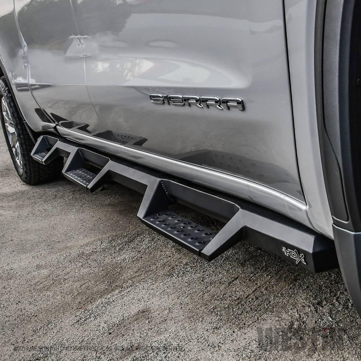 Westins HDX Drop Wheel-to-Wheel Nerf Step Bars feature a notched bar design with a 3rd step location for easy bed access. They provide strong traction with over 2 inches more of toe/heel step area than our Westin's HDX Drop W2W Nerf Step Bars include an added 3rd step location for easier bed area and cargo access. HDX also boasts more than 2 inches of added toe/heel step area which far exceeds all other competitive brands. HDX's notched bar design construction results in a reliable long lasting Bar, with a solid fit and a rugged look. The added length of HDX Drop Wheel-to-wheel Nerf Step Bars provides users with better cab access and better footing and traction for both drivers and passengers. Product includes mount kit and is offered in a variety of vehicle specific applications. Bolt-on installation so no drilling required. Mount kit included. Westin's exclusive Isolator Bracket supports the step bar past the truck cab, a feature that competitors do not offer. Without an Isolator Bracket, the step area that extends past the vehicle is left unsupported. Our unique design provides extra bed support without resulting in annoying creaking sounds.