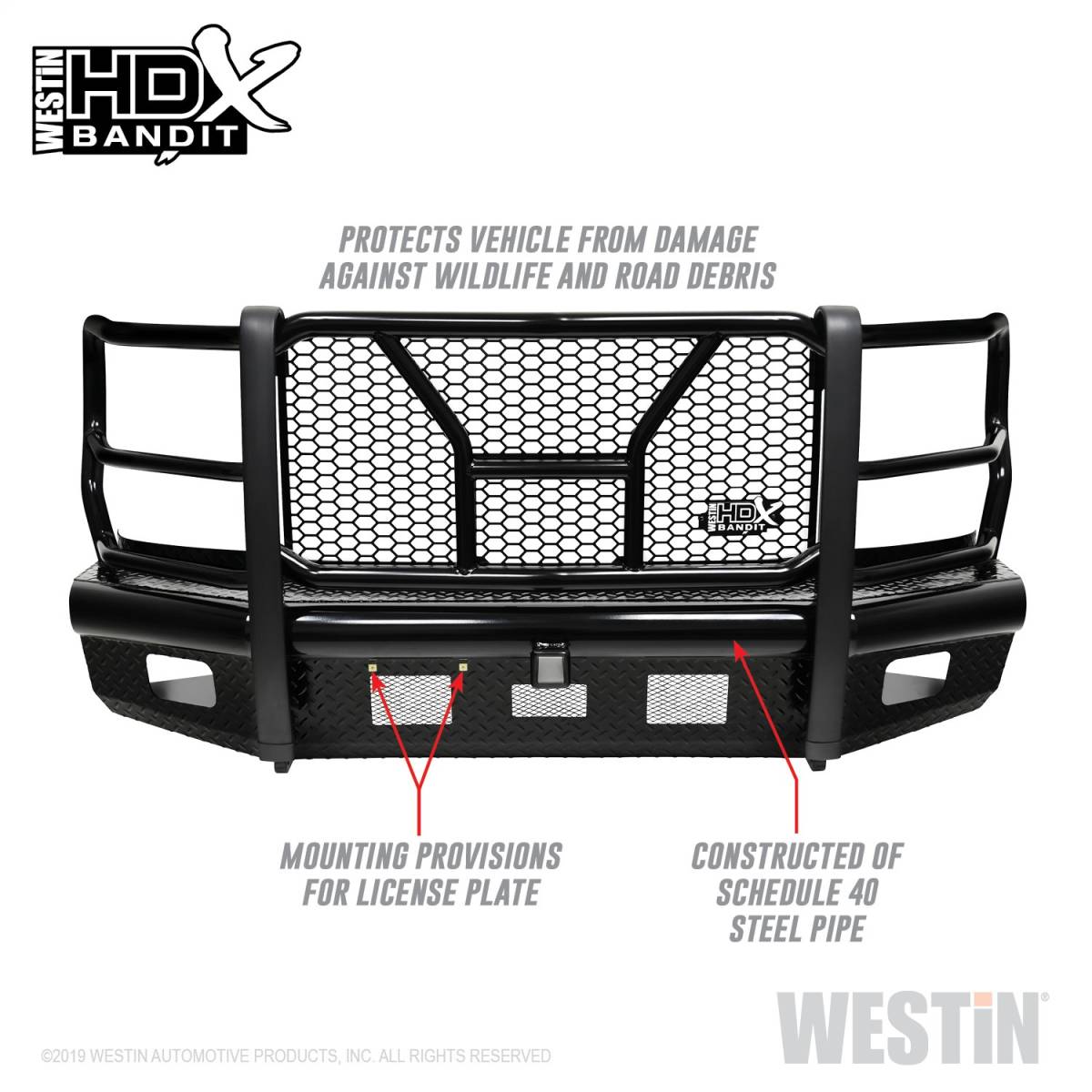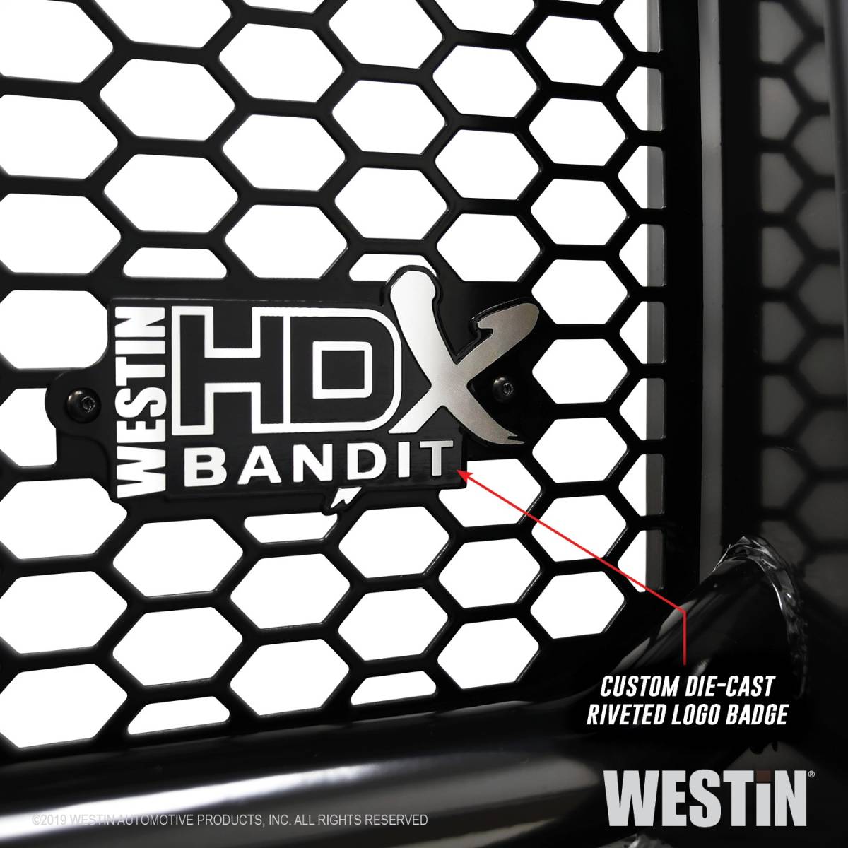 Westins HDX Bandit Bumper combines a heavy duty diamond plate steel bumper constructed of schedule 40 steel pipe with a stylish grille guard featuring 2" diameter outer wraparound wings and 2 3/4" wide upright rubber strips. Designed to protect headlights, grille, hood and front fenders from road hazards, debris and wildlife damage. Features a stylish metal honeycomb mesh screen, which allows maximum airflow to the intercooler or radiator area while accenting the front end styling with a clean and rugged look. Removable mesh screens allow for factory camera and adaptive cruise control options available on some late model Ford applications. HDX Bandit Bumper includes a built-in 2" receiver hitch and (2) heavy duty 9,500 lbs bow shackle mounts, capable of delivering multiple towing options. Compatible for factory fog lamps or LED post mount lights. In addition, some late model Ram and Chevrolet applications feature provisions for factory parking sensors. Bolt-on installation with hardware and mounting brackets included. Available in black powder coat finish.