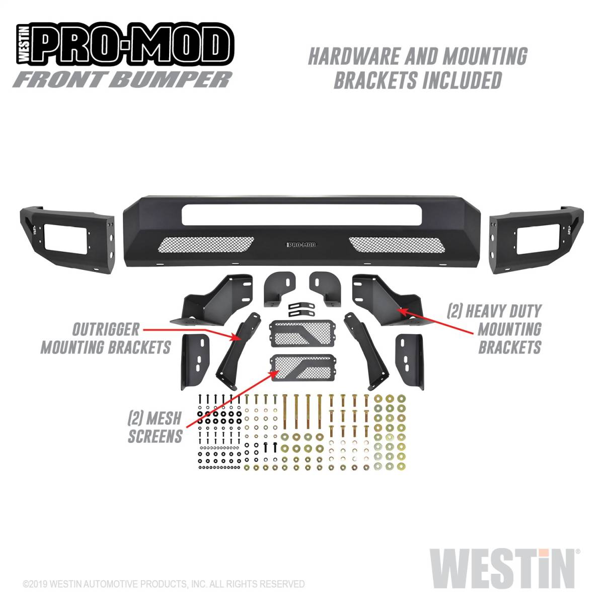 Westins Pro-Mod Front Bumper combines enhanced vehicle protection, with great looks. Pro-Mods revolutionary lightweight modular design is uniquely engineered with outrigger reinforcement brackets to provide maximum front end protection without compromising on strength, integrity or durability. The "high and tight" bumper profile creates a greater approach angle, which significantly improves off-road driving capabilities. The lightweight design also requires smaller shipping packages which dramatically reduces shipping costs. Pro-Mod bumpers feature a textured black finish with an e-coated base coat, providing long lasting corrosion protection from the elements. Once you see the Pro-Mod Front Bumper, the choice becomes obvious.