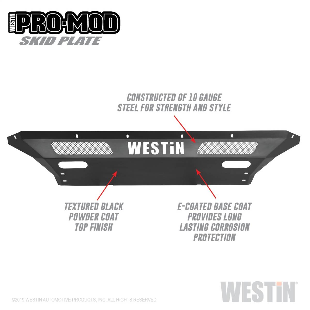 Westin's Pro-Mod Skid Plate is constructed of durable 10 gauge steel to protect your vehicle from damage caused by road debris. It mounts directly to the frame and includes a laser-cut Westin logo. Offers bolt-on installation so no drilling is required. Hardware and mounting brackets included.