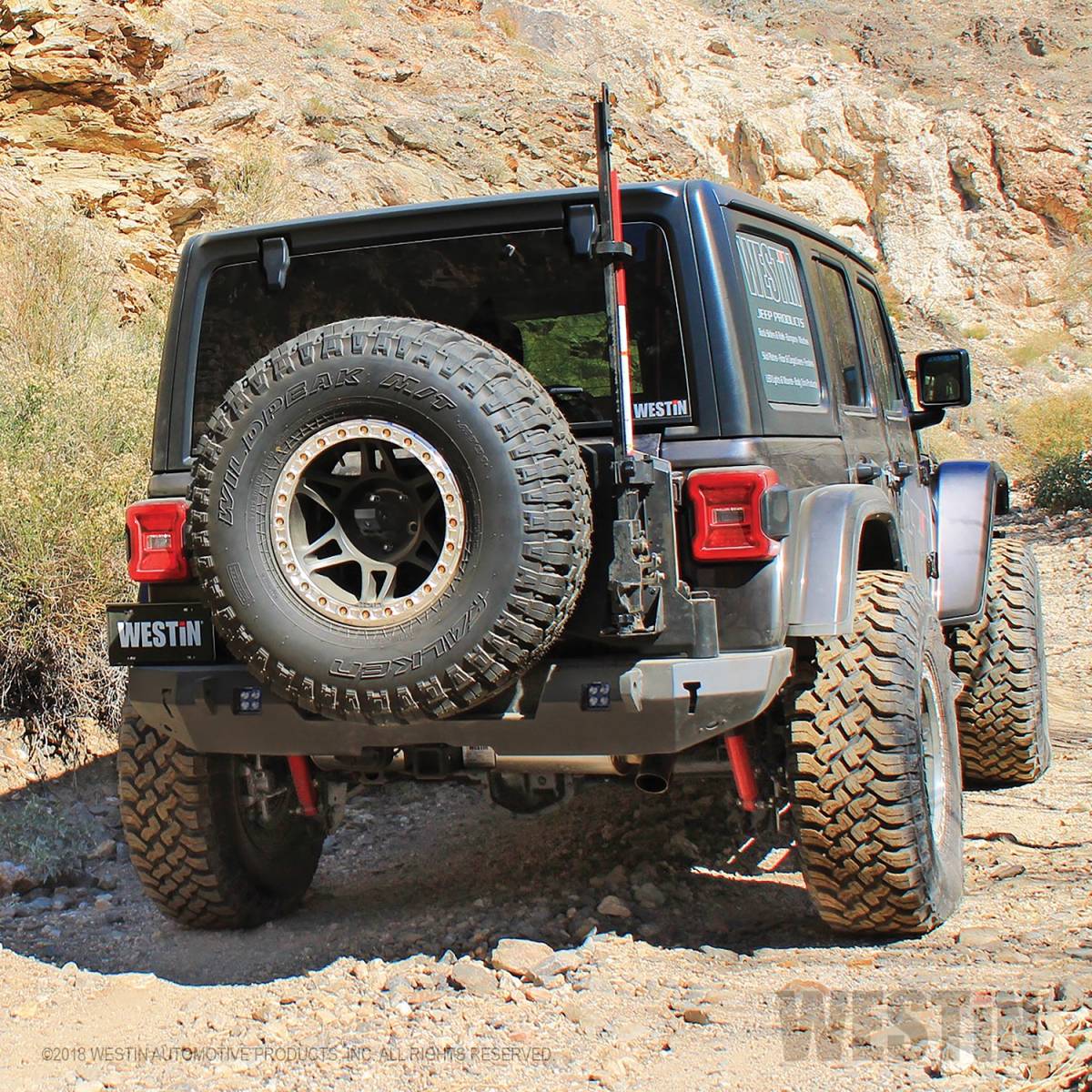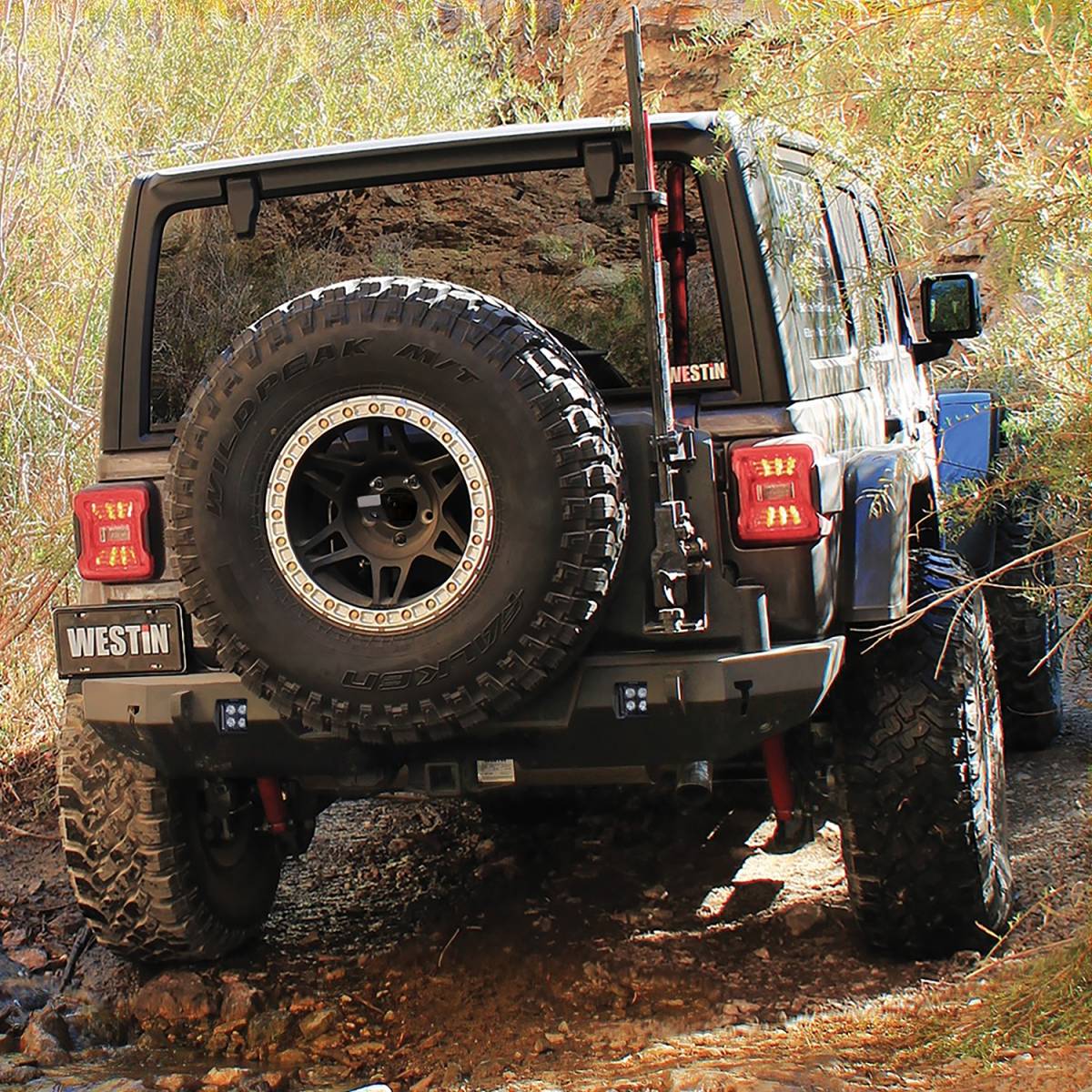 Westins WJ2 Rear Bumper with Tire Carrier is constructed with 3/16-inch plate steel with an 8 gauge tire carrier. The tire carrier is designed to work with or without factory or Westin hitches, and opens and closes with the tailgate. Tapered roller bearings and 2 turnbuckle heim links improve carrier rigidity while its bolt-on spindle allows adjustment of the carrier separate from the bumper. Features integrated recovery shackle mount points as well as additional mount points for Auxiliary Lights and Rock Lights. Includes 2 off-road jack points, license plate locator, trailer plug, fender gap transition plates, camera back-up relocator and more. Offers a bottom frame mount that helps prevents the bumper from rotating. Product includes bumper, mounting hardware and install instructions.