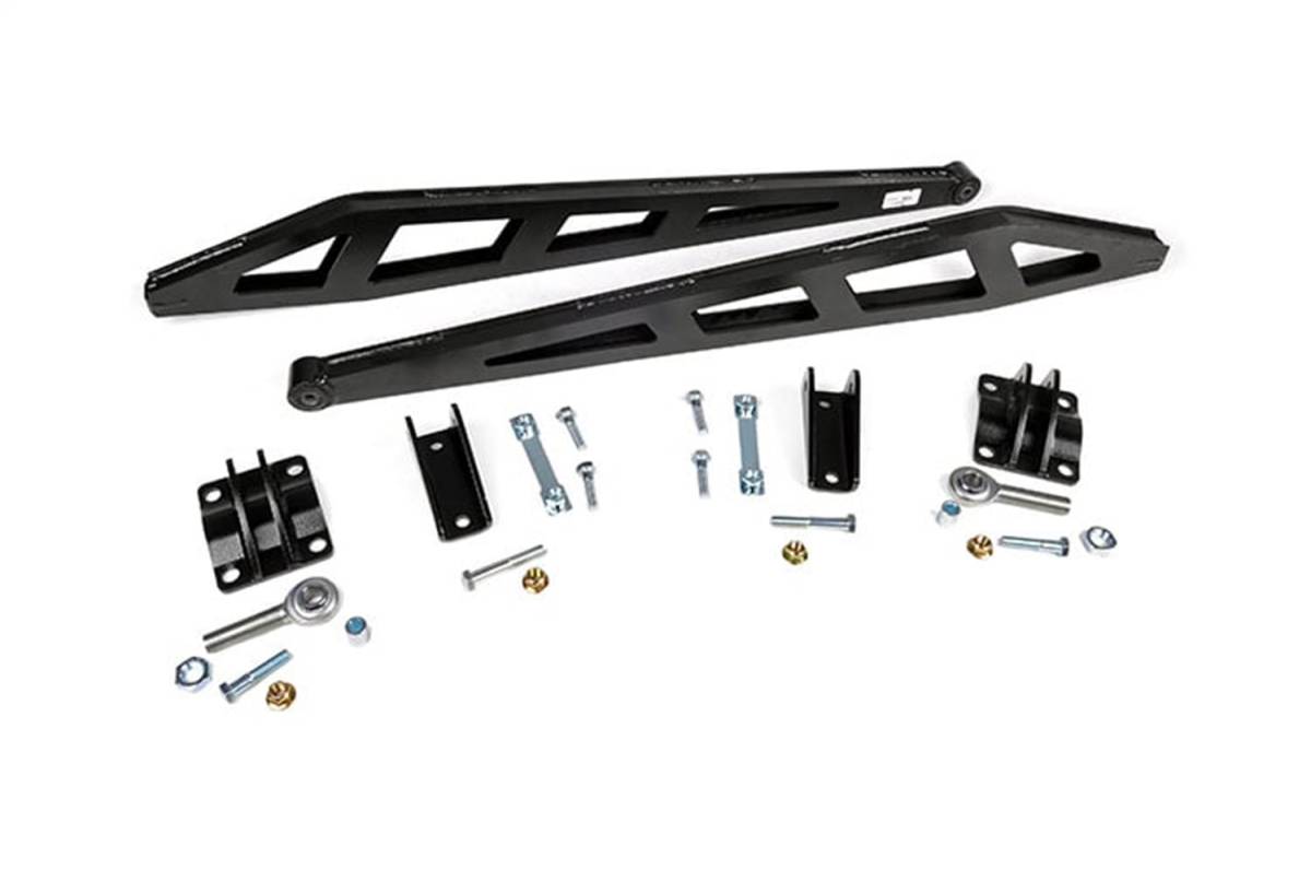 Get a grip with Rough Countrys Traction Bar Kit for 07-up GM 1500 Models. These heavy-duty Traction Bars help prevent wheel hop and axle wrap by aligning and stabilizing the rear axle geometry, allowing for full travel and articulation without binding. Once installed, these bars prevent the type of movement and pinion angles that cause a loss of traction. Not just any bar can get the job done, and Rough Countrys in.Ladder Bar in. design combines relentless strength with aggressive good looks. Rough Countrys GM Traction Bars feature Clevite Rubber Bushings and a threaded Adjustable Heim End for an easier install and true adjustability. Works on any 07-up GM 1500 from stock to up to 7.5 in. lift. Best of all these Traction bars feature Rough Countrys Lifetime Replacement Warranty!