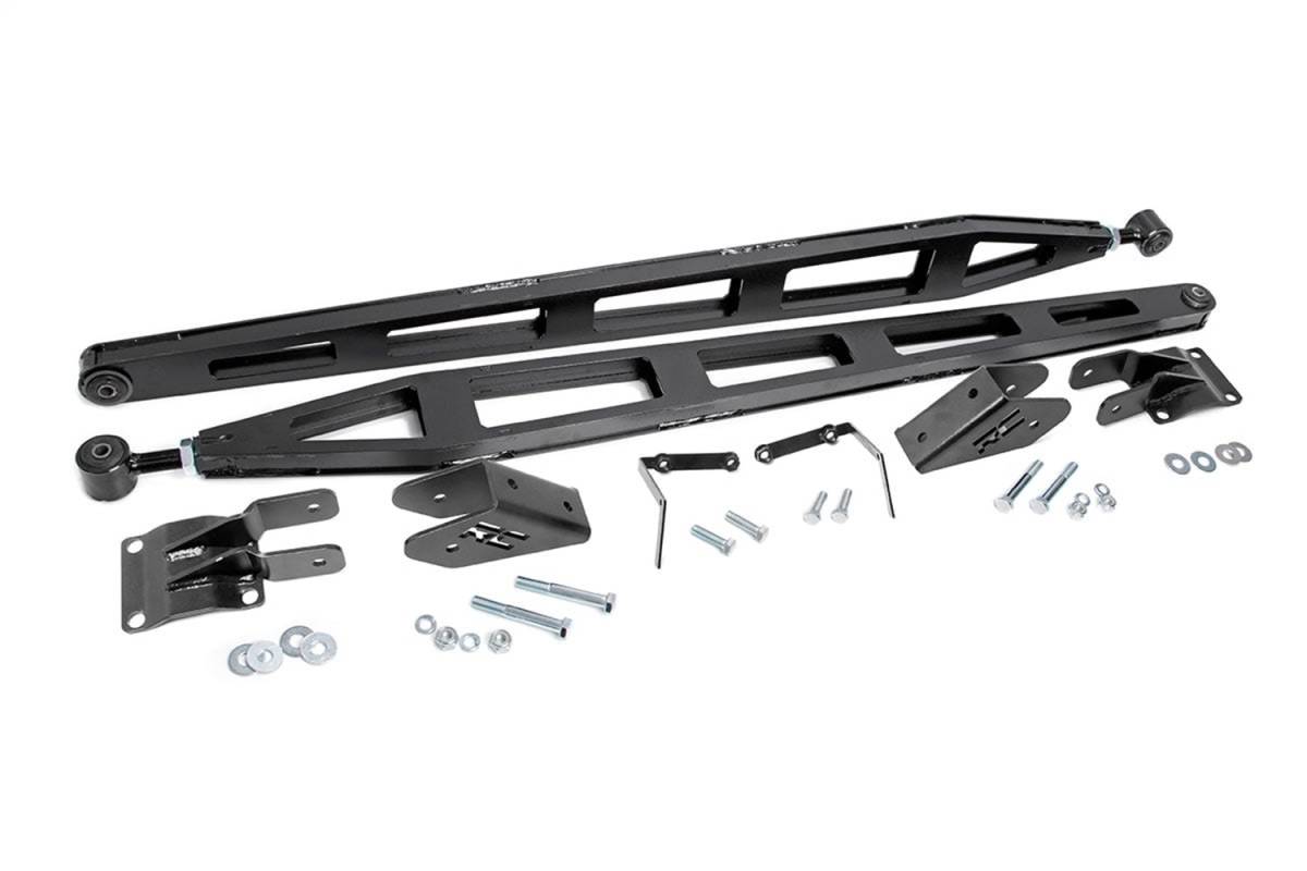 Get a grip with Rough Countrys Traction Bar Kit for 11-18 GM 2500 models. These heavy-duty Traction Bars help prevent wheel hop and axle wrap by aligning and stabilizing the rear axle geometry, allowing for full travel and articulation without binding. Once installed, these bars prevent the type of movement and pinion angles that cause a loss of traction. Perfect for re-claiming traction while towing or during quick acceleration.Not just any bar can get the job done, and Rough Countrys in.Ladder Bar in. design combines relentless strength with aggressive good looks. Rough Countrys GM 2500 Traction Bar features Clevite Rubber Bushings and a threaded adjustable end for an easier install and true adjustability. Includes mounting plates with laser-etched 'œRC' logo. Works on any 11-18 Chevy or GMC 2500 with 6 inches of lift. Best of all these Traction bars feature Rough Countrys Lifetime Replacement Warranty!