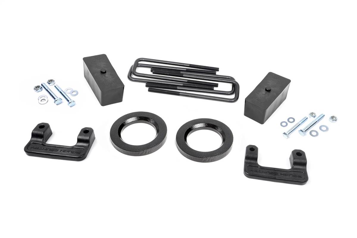 Off-Road Action has never been more affordable thanks to Rough Countrys new 2.5 in. Suspension lift for 07 & Up GM 1500 Pickups. If youre looking for something more than a simple leveling kit, look no further! This new design utilizes our popular 2 in. Lower Strut Extensions combined with a set of strut spacers and rear blocks to achieve a total of 2.5 in. of lift - enough clearance to run up to a 285/70/17 tire - all at a price that wont break the bank! This kit includes a set of Fabricated 2 in. Rear Blocks to replace the OEM 1 in. block. Fabricated blocks offer a longer lifespan than cast blocks and are less susceptible to damage and the environment. Not only is this kit affordable, its also easy to install, featuring a 100% bolt-on installation procedure with no need for a strut compressor to install. Lift your 1500 easily, efficiently, and cost effectively.