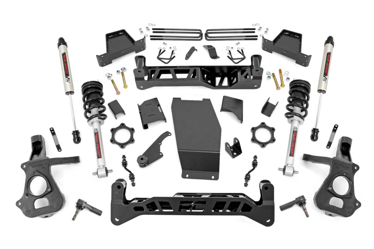 Get the look you really want with Rough Countrys 7-inch Suspension Kit for 4WD 14+ Chevy / GMC 1500 Pickups. This massive kit affords your truck the ability to run 35-inch tires on factory wheels with our beefy lifted knuckles and is designed with 100% laser-cut materials for the best possible fit on your vehicle.Includes a set of front and rear high-clearance cross members featuring the in.RC in. logo and a differential skid-plate. Each kit also comes with a set of durable, fabricated anti-wrap lift blocks that offer a huge boost while helping prevent axle wrap issues.Give your pickup an aggressive, lifted and level stance with incredible ride quality! Our innovative Lifted Knuckle design boosts ride height while keeping all components at the optimum angles for a factory-like ride. This kit includes a set of rear V2 Monotube Shocks, engineered for on and off-road use. Includes Rough Countrys Lifetime Replacement Warranty.