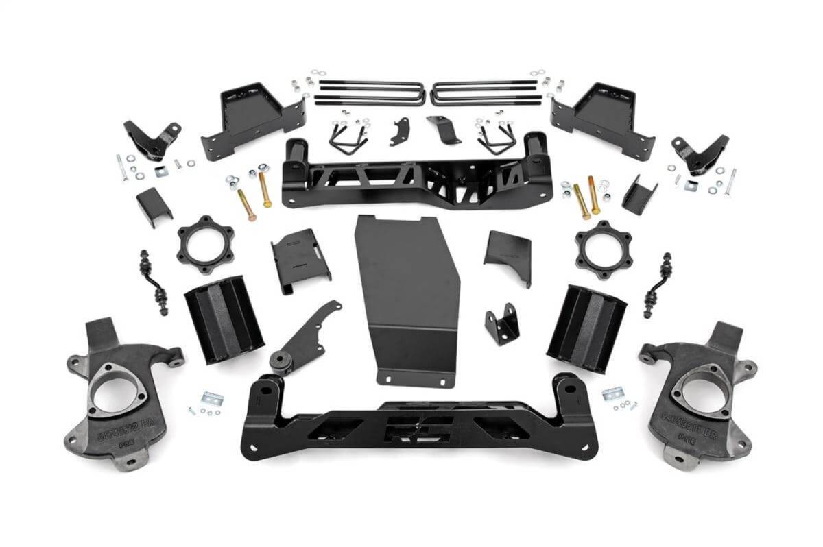 Get the look you really want with Rough Countrys 7-inch Suspension Kit for GMC Sierra Denali 1500 Pickups equipped with Magnetic Ride Control. This massive kit affords your truck the ability to run 35-inch tires on factory wheels with our beefy lifted knuckles and is designed with 100% laser-cut materials for the best possible fit on your vehicle.Includes a set of front and rear high-clearance crossmembers featuring the in.RC in. logo and a differential skid-plate. Each kit also comes with a set of durable, fabricated lift blocks that are stronger and offer a longer lifespan than cast blocks.Give your pickup an aggressive, lifted and level stance with incredible ride quality! Our innovative Lifted Knuckle design boosts ride height while keeping all components at the optimum angles for a factory-like ride. Includes Rough Countrys Lifetime Replacement Warranty.