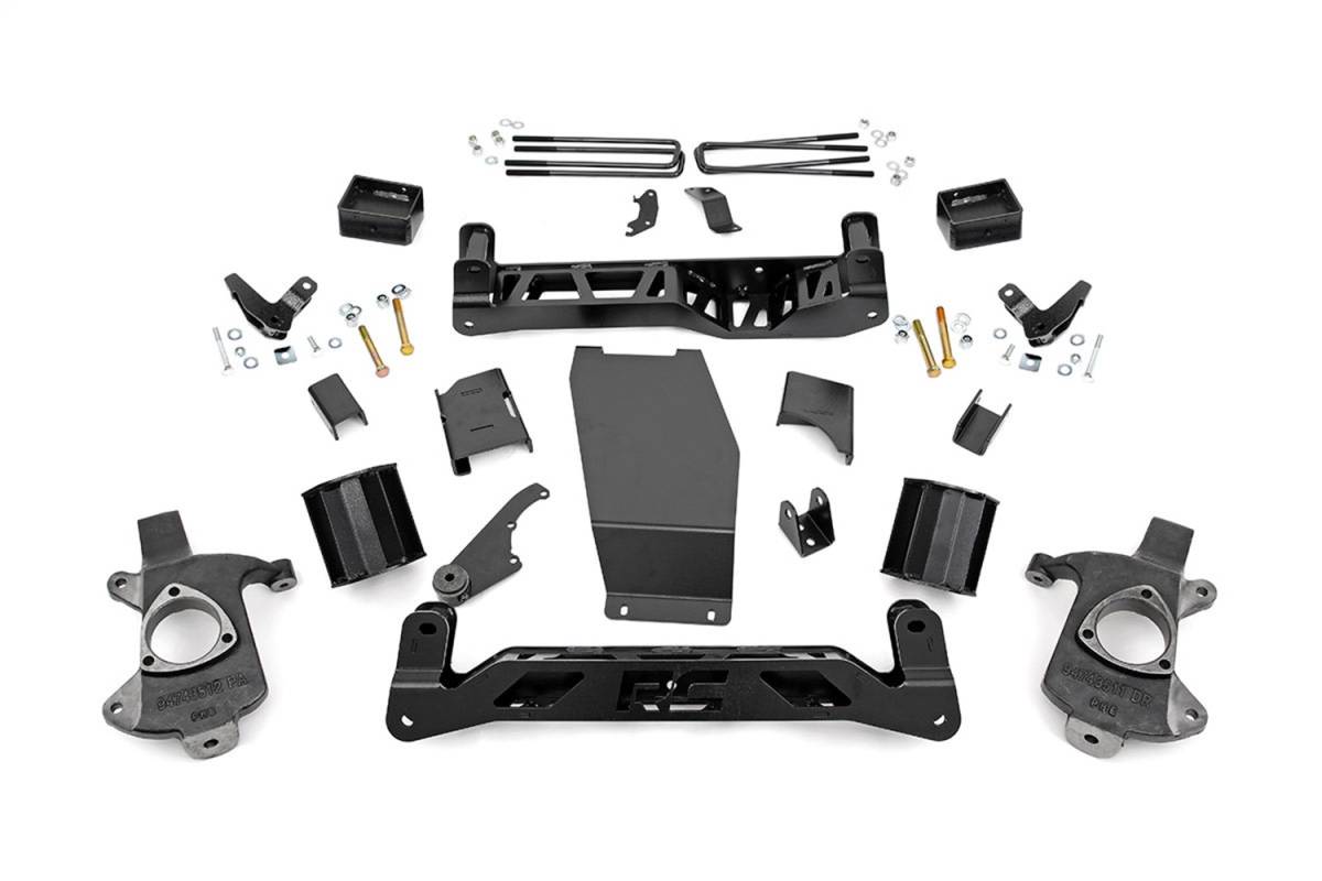 Get the look you really want with Rough Countrys 5-inch Suspension Kit for GMC Sierra Denali 1500 Pickups equipped with Magnetic Ride Control. This massive kit affords your truck the ability to run 33-inch tires on factory wheels with our beefy lifted knuckles and is designed with 100% laser-cut materials for the best possible fit on your vehicle.Includes a set of front and rear high-clearance crossmembers featuring the in.RC in. logo and a differential skid-plate. Each kit also comes with a set of durable, fabricated lift blocks that are stronger and offer a longer lifespan than cast blocks.Give your pickup an aggressive, lifted and level stance with incredible ride quality! Our innovative Lifted Knuckle design boosts ride height while keeping all components at the optimum angles for a factory-like ride. Includes Rough Countrys Lifetime Replacement Warranty.