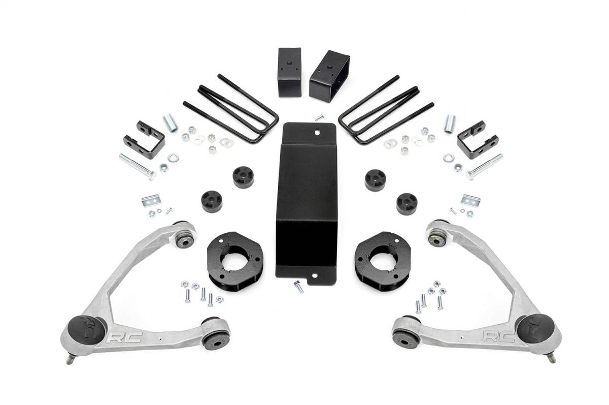 Gain increased ground clearance and killer, good looks with Rough Countrys 3.5in Suspension Lift for GMC Sierra Denali 1500 Pickups equipped with Magnetic Ride Control.This all-inclusive kit comes with several fantastic features - all at a price thatll leave plenty of room for new tires and wheels! Rough Countrys 3.5in Denali MagneRide lift comes equipped with a set of differential drop spacers, 3in fabricated rear blocks, and a protective differential skid plate for enhanced durability.This kit also features upper control arms with upgraded Ball Joints by MOOG, the most trusted name in Ball Joint design. Easy to install and easier to maintain than any other joint on the market, the Moog Ball Joint system utilizes two powdered-metal gusher bearings with grease grooves to provide the most durable wear surface available. A sealed boot design with grease-relief valve keeps contaminants out while providing a sealed, serviceable environment. Also included in this kit are a set of fabricated rear blocks. Fabricated blocks are stronger and offer a longer lifespan than cast blocks while being less susceptible to damage and the environment.