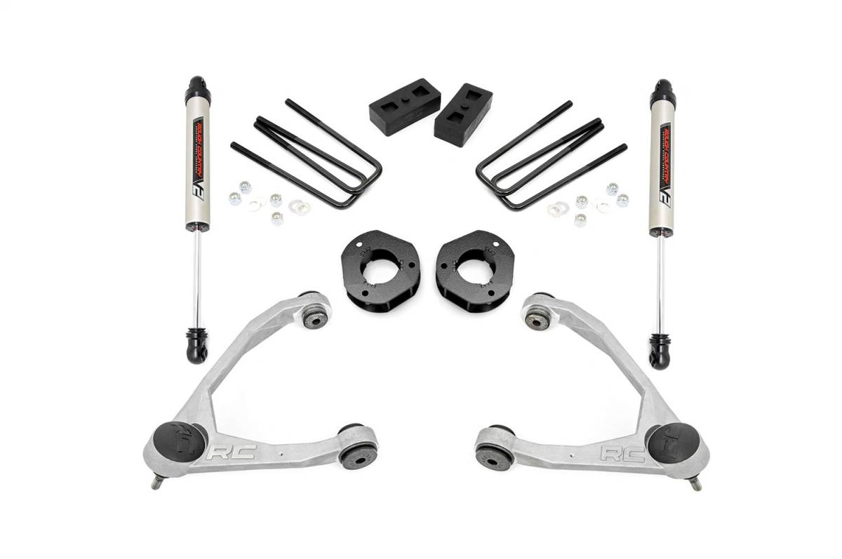 This all-inclusive kit comes with several fantastic features - all at a price thatll leave plenty of room for new tires and wheels!This kit features Rough Countrys premium V2 Monotube shocks! These 10-stage variable valving, high-pressure Nitrogen charged shocks offer a fantastic blend of off-road action and smooth highway ride quality. With a durable 18mm spring-loaded piston rod and faster-cooling 54mm shock body, this shock offers up to 36kN Tensile Strength for a long lifespan of impressive vibration dampening. Features natural rubber bushings and an eye-catching metallic silver paint.This kit also features upgraded ball joints that are easy to install and maintenance free. These POM ball joints offer a greater range of motion for more wheel articulation than standard or OE replacements and feature a Polyoxymethylene ball race with an extremely low coefficient of friction for longer life, and a larger ball diameter to improve range of motion with a maintenance free design. Also included in this kit are a set of fabricated rear blocks. Fabricated blocks are stronger and offer a longer lifespan than cast blocks while being less susceptible to damage and the environment. Includes a Lifetime Replacement Warranty!