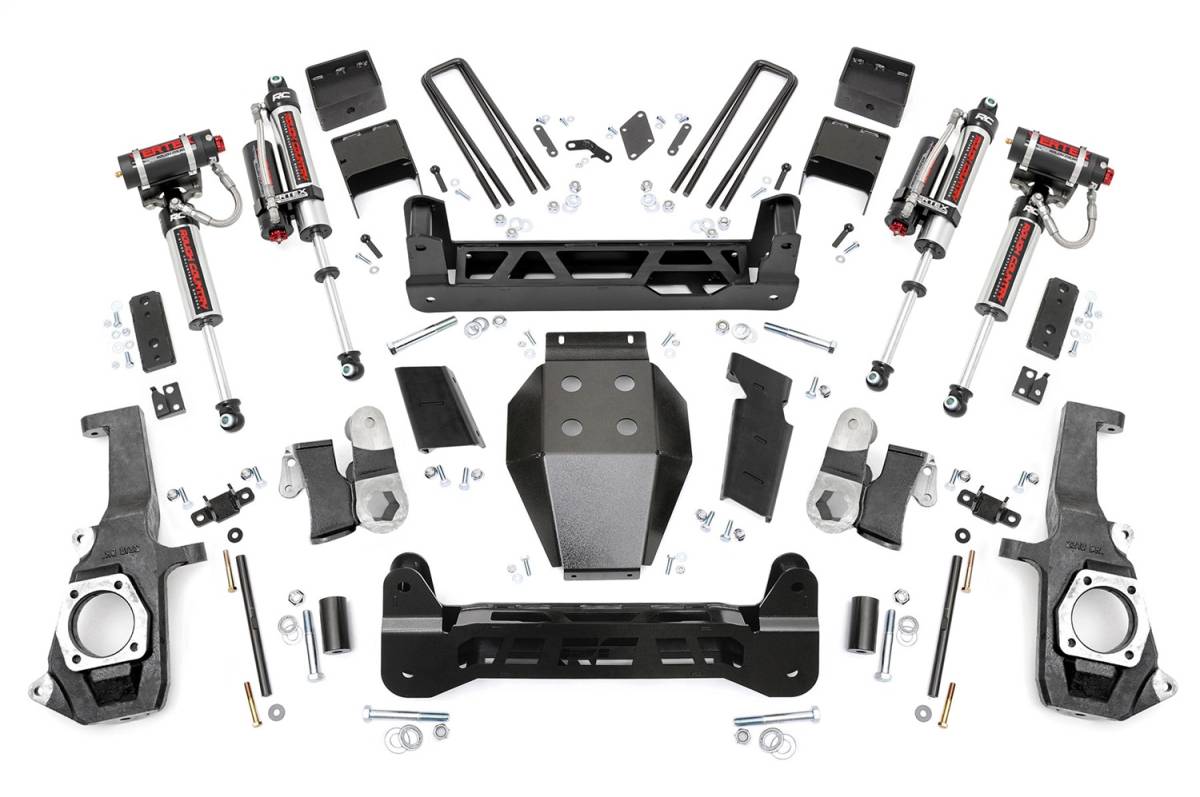 Right off the lot The GM 2500 HD has an impressive stance and a killer look, inspiring Rough Country to build a kit that would add crucial enhancements while taking nothing away from this sharp looking, new model truck. The 5 in. N3 Suspension Lift for GM 2500 HD features a Non-Torsion Drop Design for better clearance and handling while maintaining proper angles in a in.clean and tucked away in. fashion. This kit also features Heavy Duty components worthy of the HD badge; With 1/4 in. thick steel crossmembers, 1/2 in. thick NTD Brackets, and a durable, thick Skid Plate - all laser-cut and powder coated in our in.Hammer Black in. color to match the factory components. Installation requires no drilling or modifying the differential, meaning no in.invasive in. mods to your new toy. A set of braided Stainless Steel Brake Lines hones the whole package in.Our innovative HD lift doesnt just look like it came from the showroom floor, it drives like it did too. This kit doesnt widen the stock track width, and the Non Torsion Drop design keeps everything at optimum angles, leaving that factory feel to handling corners and turns. A full set of Nitrogen charged N3 Shock Absorbers offer 10-Stage velocity sensitive valving, and are custom valved for each model kit we offer - meaning you get a set of shocks designed to preserve your factory ride quality.