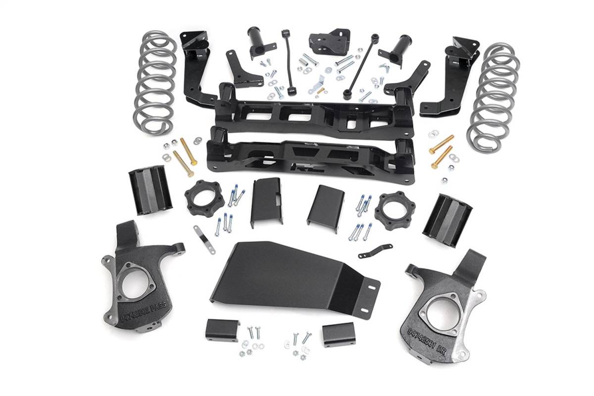 This all-inclusive kit ships with everything you need to get going and hit the mudholes. Featuring a set of beefy lifted knuckles and 1/4in thick steel front and rear high-clearance crossmembers, this kit offers plenty of muscle to handle hazards both on and off-road.A set of Lifted Coil Springs and Upper Strut Spacers provide plenty of ride height - enough to run up to a 33in tire on our 5in option, or a 35in tire on our 7in option. Both kits feature sway-bar links, shock extensions, brakeline brackets, a rough and tumble lower skid plate, and Grade 8 Hardware.Included sway-bar drop brackets and differential drop brackets help keep vehicle components properly aligned after lifting, providing a factory-like ride while boasting an aggressive stance.