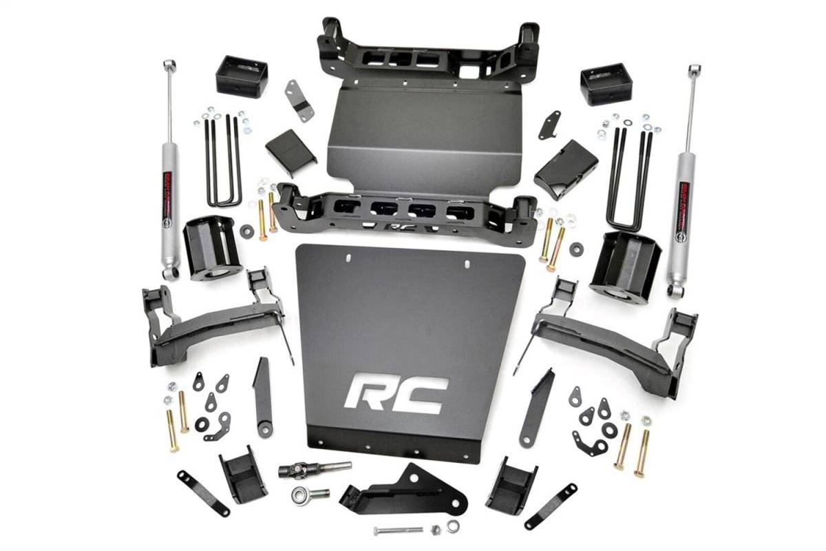 What better way to deck out that brand new 2014-up GM 1500 you worked so hard for than with the aggressive stance and jaw-dropping ride height of Rough Countrys brand-new 5-inch Suspension Lift for 2014 Chevy / GMC 1500 Pickups? This massive lift is designed to retain your stock track width! This affords your truck the ability to run up to an impressive 33-inch tire on factory 20-inch wheels, and gives you a nearly limitless choice in aftermarket wheels and tires that other kits just cant fit.This kit ships with EVERYTHING you need to give your new truck the aggressive stance and capabilities it deserves; Stout upper strut spacers, a beefy front and rear skid plate, our Heavy Duty Front and Rear Crossmembers, and a set of differential and sway-bar drop brackets - all designed by our in-house Research and Development team with 100% laser-cut materials for the best possible fit on your vehicle.Also included are a set of our Nitrogen charged N3 Shocks! Offering the best in balanced performance for on and off-road use, these shocks feature a 10-stage velocity sensitive valving custom tuned for this specific application. That means these shocks are specifically valved for use with this vehicle and lift combo, giving you unparalleled performance for any driving situation.