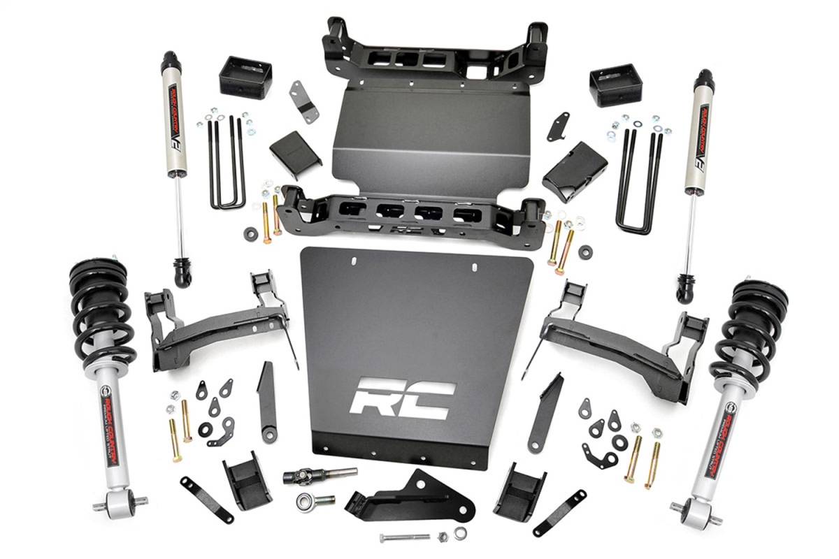 What better way to deck out that brand new 2014-up GM 1500 you worked so hard for than with the aggressive stance and jaw-dropping ride height of Rough Countrys brand-new 5-inch Suspension Lift for 2014 Chevy / GMC 1500 Pickups? This massive lift is designed to retain your stock track width! This affords your truck the ability to run up to an impressive 33-inch tire on factory 20-inch wheels, and gives you a nearly limitless choice in aftermarket wheels and tires that other kits just cant fit.This kit ships with EVERYTHING you need to give your new truck the aggressive stance and capabilities it deserves; Stout upper strut spacers, a beefy front and rear skid plate, our Heavy Duty Front and Rear Crossmembers, and a set of differential and sway-bar drop brackets - all designed by our in-house Research and Development team with 100% laser-cut materials for the best possible fit on your vehicle.Also included are a set of our Nitrogen charged V2 Monotube Shocks! Offering the best in balanced performance for on and off-road use, these shocks feature a 10-stage velocity sensitive valving custom tuned for this specific application. That means these shocks are specifically valved for use with this vehicle and lift combo, giving you unparalleled performance for any driving situation.
