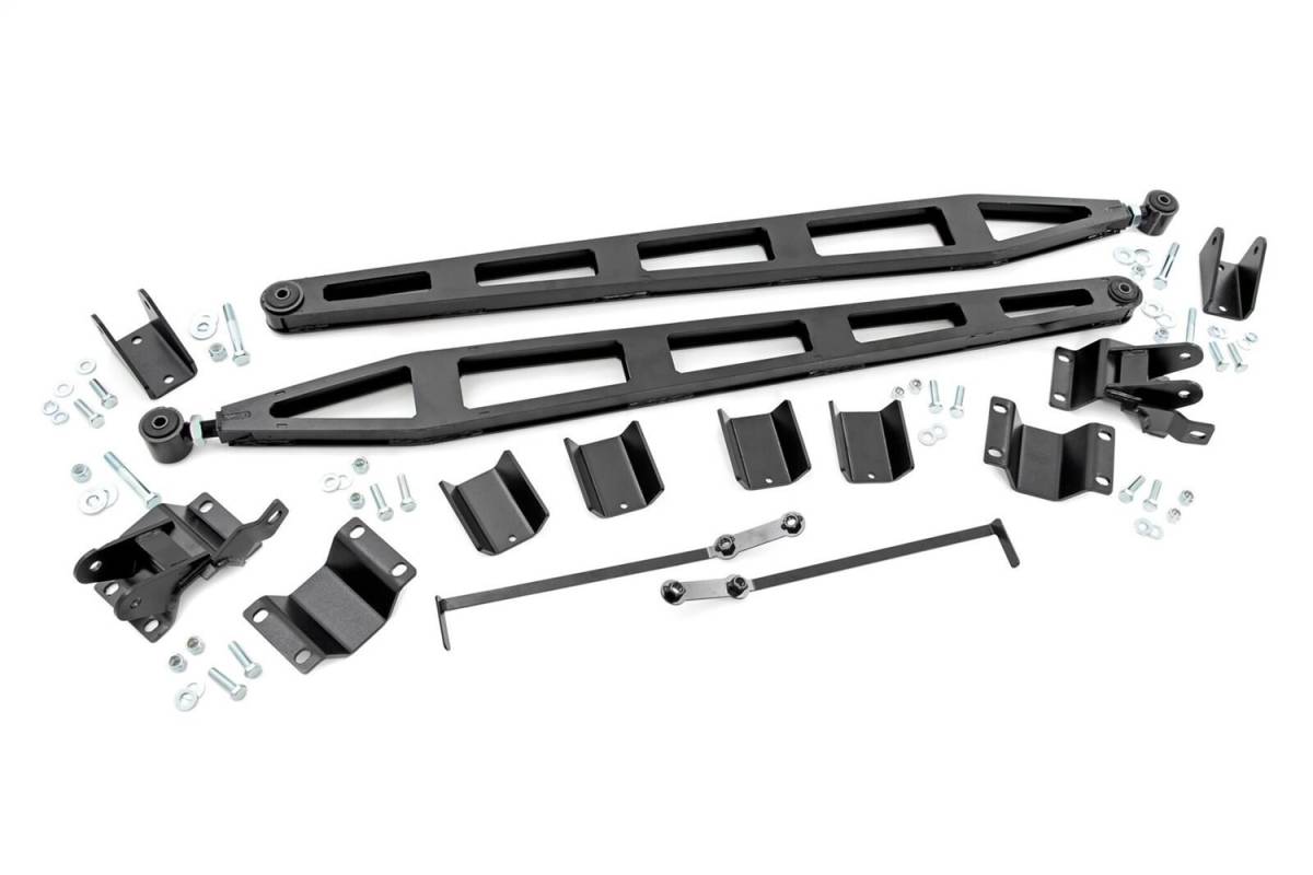 Get a grip with Rough Countrys Traction Bar Kit for 03-13 RAM 2500 models. These heavy-duty Traction Bars help prevent wheel hop and axle wrap by aligning and stabilizing the rear axle geometry, allowing for full travel and articulation without binding. Once installed, these bars prevent the type of movement and pinion angles that cause a loss of traction. Perfect for re-claiming traction while towing or during quick acceleration.Not just any bar can get the job done, and Rough Countrys in.Ladder Bar in. design combines relentless strength with aggressive good looks. Rough Countrys RAM 2500 Traction Bar features Clevite Rubber Bushings and a threaded adjustable end for an easier install and true adjustability. Includes mounting plates with laser-etched 'œRC' logo. Works on any 03-13 RAM 2500 from stock to 5 inches of lift. Best of all these Traction bars feature Rough Countrys Lifetime Replacement Warranty!