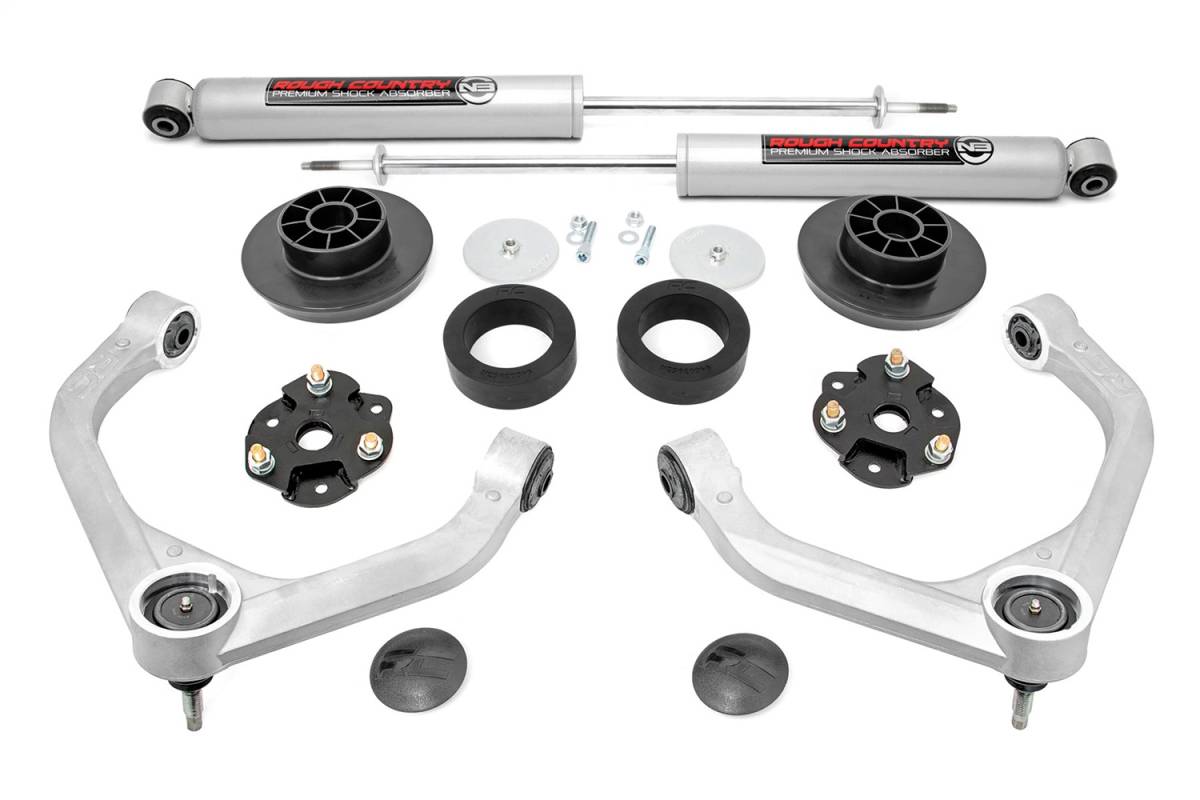 Rough Countrys 3.5in Bolt-on kit offers easy installation and aggressive good looks at an incredible value. Take your truck to new heights with this excellent option for RAM 1500 pickups.This kit features a set of high-quality, forged aluminum upper control arms designed to make alignment adjustments easier and Clevite rubber bushings for enhanced durability. These arms are designed to promote a factory-like geometry by keeping the ball joint at optimum angles after lifting. This design allows for an improved, greater range of motion from the ball-joint, with less stress, wear and tear.Rough Countrys 3.5' Bolt-on Kit features a set of durable front and rear spacers to provide additional ground clearance. Once installed, this kit gives your truck plenty of ride height for up to 295/60R20 tires while offering a clean, level look from front to rear. This kit also features Rough Countrys Nitrogen-charged N3 Shocks for a fantastic blend of off-road action and smooth highway ride quality!This all-inclusive kit comes with everything you need, and installation is a piece of cake compared to other kits on the market! Featuring a 100% bolt-on installation process that requires zero cutting or drilling, this kit can be installed using common tools in a home garage, and allows the truck to be returned to stock at any time if so desired. Best of all this kit features Rough Countrys Lifetime Replacement Warranty.