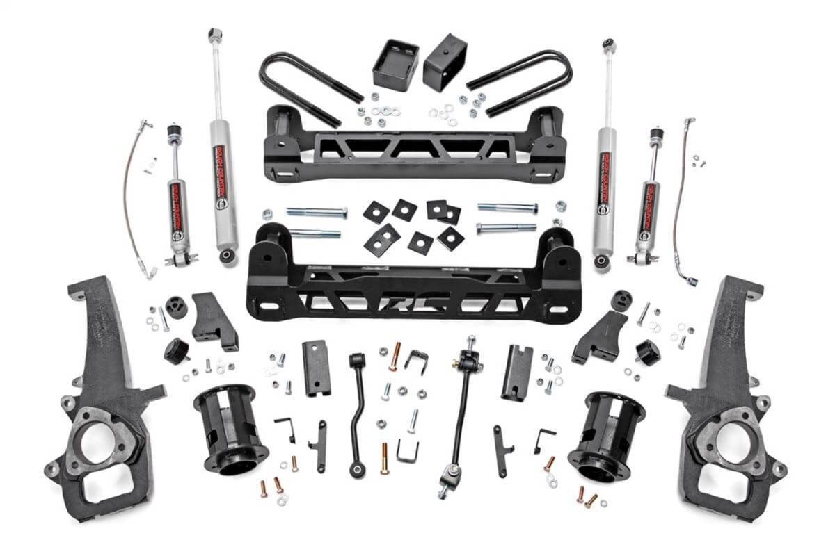 Give your RAM 1500 the perfect blend of performance, protection, and style with Rough Countrys 6-inch Suspension Lift. Designed to offer an affordable way to maximize off-road performance and run up to 35-inch tires, these kits offer high quality, heavy-duty equipment for new model RAM 1500s. Utilizing heavy-duty, laser cut, steel equipment engineered by Rough Country, these 6-inch Suspension Lifts are complete kits that include everything needed for outstanding off-road performance. High-clearance front and rear cross-members provide enough room for off-road climbs and runs. A heavy-duty skid plate shields the vehicles differential, protecting you from hazardous terrain. A durable set of driver and passenger side lifted cast knuckles are also included, helping to promote proper geometry once the vehicle is lifted. For true trailblazers, this kit also ships with a set of rear N3 Nitrogen-charged shock absorbers - valved specifically for a blend of on and off-road performance. Includes Rough Countrys Lifetime Replacement Guarantee!