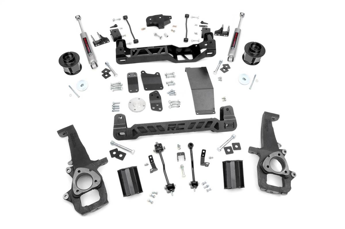 Give your RAM 1500 the perfect blend of performance, protection, and style with Rough Countrys 6-inch Suspension Lift. Designed to offer an affordable way to maximize off-road performance and run up to 37-inch tires, these kits offer high quality, heavy-duty equipment for new model RAM 1500s. Utilizing heavy-duty, laser cut, steel equipment engineered by Rough Country, these 6-inch Suspension Lifts are complete kits that include everything needed for outstanding off-road performance. High-clearance front and rear cross-members provide enough room for off-road climbs and runs. A heavy-duty skid plate shields the vehicles differential, protecting you from hazardous terrain. A durable set of driver and passenger side lifted cast knuckles are also included, helping to promote proper geometry once the vehicle is lifted. For true trailblazers, this kit also ships with a set of rear N3 Nitrogen-charged shock absorbers - valved specifically for a blend of on and off-road performance. Includes Rough Countrys Lifetime Replacement Guarantee!