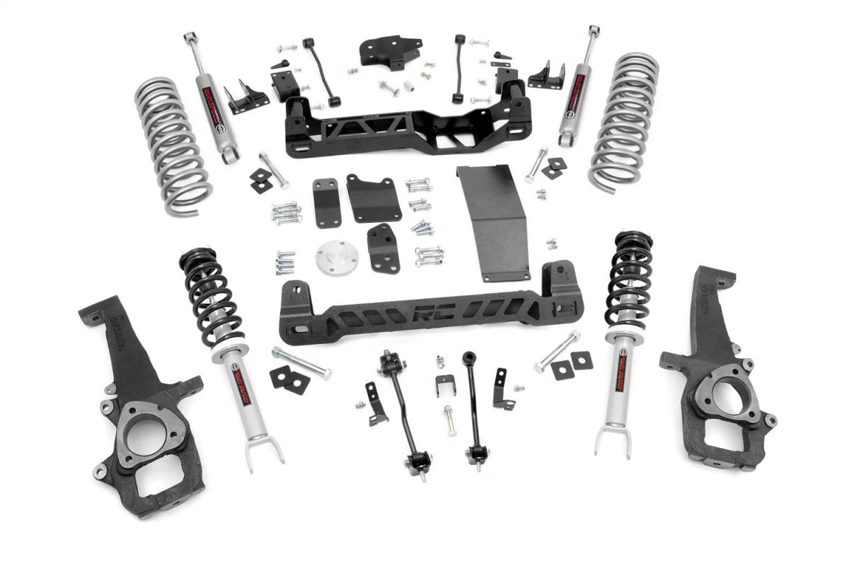 Give your RAM 1500 the perfect blend of performance, protection, and style with Rough Countrys 6-inch Suspension Lift. Designed to offer an affordable way to maximize off-road performance and run up to 37-inch tires, these kits offer high quality, heavy-duty equipment for new model RAM 1500s. Utilizing heavy-duty, laser cut, steel equipment engineered by Rough Country, these 6-inch Suspension Lifts are complete kits that include everything needed for outstanding off-road performance. High-clearance front and rear cross-members provide enough room for off-road climbs and runs. A heavy-duty skid plate shields the vehicles differential, protecting you from hazardous terrain. A durable set of driver and passenger side lifted cast knuckles are also included, helping to promote proper geometry once the vehicle is lifted. For true trailblazers, this kit also ships with a set of rear N3 Nitrogen-charged shock absorbers - valved specifically for a blend of on and off-road performance. Includes Rough Countrys Lifetime Replacement Guarantee!