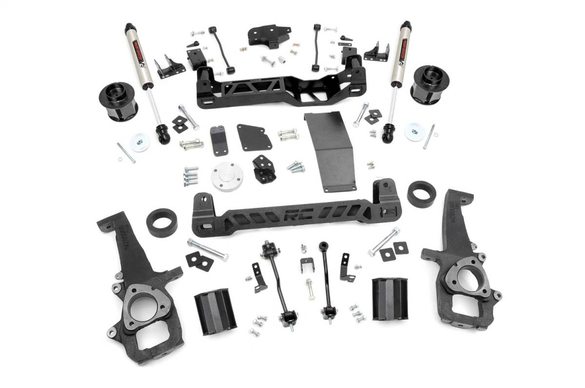 Give your RAM 1500 the perfect blend of performance, protection, and style with Rough Countrys 6-inch Suspension Lift. Designed to offer an affordable way to maximize off-road performance and run up to 37-inch tires, these kits offer high quality, heavy-duty equipment for new model RAM1500s. Utilizing heavy-duty, laser cut, steel equipment engineered by Rough Country, these 6-inch Suspension Lifts are complete kits that include everything needed for outstanding off-road performance. High-clearance front and rear cross-members provide enough room for off-road climbs and runs. A heavy-duty skid plate shields the vehicles differential, protecting you from hazardous terrain. A durable set of driver and passenger side lifted cast knuckles are also included, helping to promote proper geometry once the vehicle is lifted. Best of all? Youll achieve better performance, bigger tires, and considerable protection all without sacrificing the look of your truck. All components are specifically designed to keep things nice and tidy underneath, utilizing drop brackets to promote proper geometry and leaving nothing hanging out in plain sight. The beefy cross members feature a laser-cut RC logo, giving the truck a fierce, but streamlined look after lifting. Includes Rough Countrys Lifetime Replacement Guarantee!