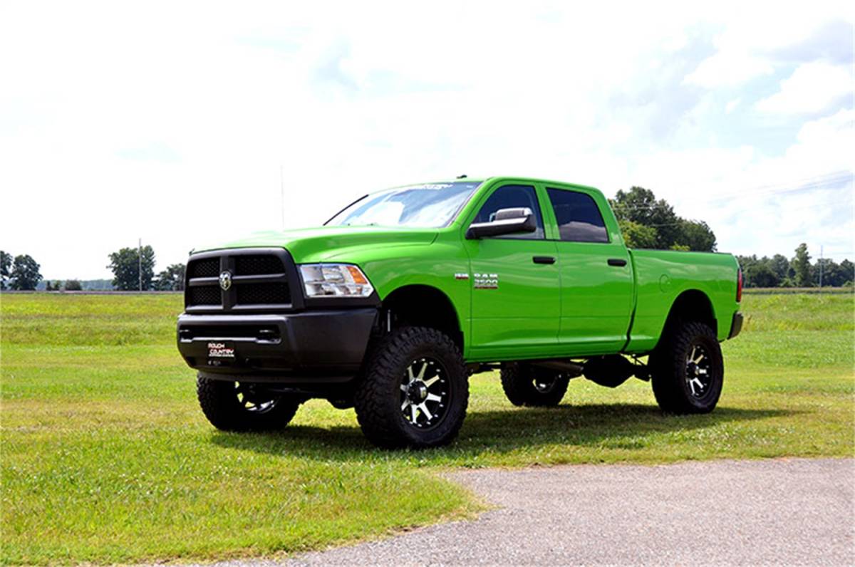 Compliment your RAM 3500s aggressive, good looks with Rough Countrys new 5-inch Lift Kit. New model RAM Trucks come with a wealth of impressive features right from the factory. Rough Countrys new 5-inch kit was engineered to retain these impressive factory specs while bumping up performance and durability where its needed most. The result is an aggressive, lifted beast with an mean profile and lush ride-quality thatll make other RAM owners wonder where you got yours from! When changing a vehicles suspension, the key to preserving ride quality is in keeping the geometry of all suspension components as close to their factory angles as possible. Rough Countrys new 5-inch Suspension kit features a set of ultra-durable Radius Arms, precision fit to bolt right into the factory mounts for an easier install and a more factory-like angle. These beefy, upgraded Radius Arms also feature a durable, Clevite Rubber Bushing for maximum vibration absorption. In a further effort to preserve the trucks factory ride, this kit retains the factory progressive rate coil spring -- designed by Dodge specifically for the weight and ride quality of these new model trucks. Get the look you really want for your truck with an easy-to-install kit, at an incredible price!
