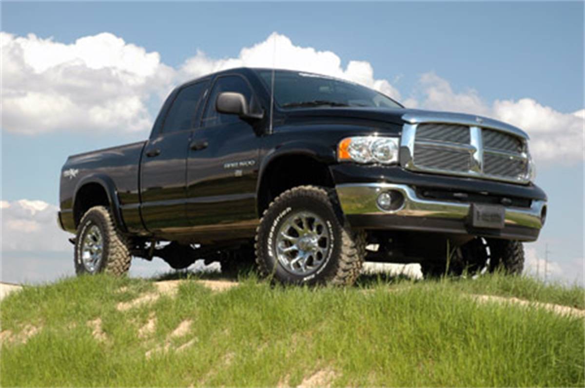 Give your 02-05 Dodge Ram 1500 an aggressive new look and unparalleled off-road performance with Rough Countrys 4-inch Suspension Lift. This all-inclusive kit features everything needed to take your Dodge off the freeway and onto the trails. Featuring a set of durable lifted knuckles, youll gain enough ride height to run up to 35-inch tires with proper wheel spacing! A set of differential drop brackets, sway-bar links, bump stop extensions, and integrated sub-frame assembly to keep everything at optimum angles for a factory-like ride, even after lifting. A front and rear steel crossmember bring uncompromising strength and good looks to your truck. Our Fabricated Rear Blocks offer considerably more strength than their cast iron counterparts. A set of Rough Countrys premium N3 shocks are also included in this kit. These fine tuned 10-stage variable high-pressure Nitrogen charged shocks offer a fantastic blend of off-road action and smooth highway ride quality. With a durable 18mm spring-loaded piston rod and faster-cooling 54mm shock body. Best of all, Rough Countrys 02-05 Dodge Ram 1500 Lift Kit is backed by our Lifetime Replacement Warranty.