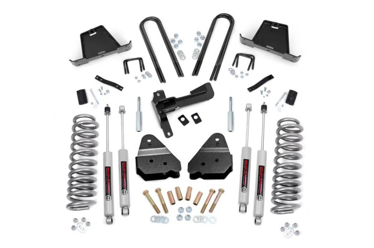 Give your 05-07 Ford Super Duty an impressive upgrade, front to back with Rough Countrys 4.5 in. Ford Suspension Lift Kit! This easy-to-install lift kit raises the front of your vehicle to be equal height with the rear for a leveled, better-than-stock look that gives an improved ride height and more aggressive appearance. This kit features a set of front, lifted coil spacers allowing you gain additional ride height without sacrificing ride quality or performance. A set of radius arm fropbrackets and track bar drop bracket are provided to keep everything at optimum angles for a factory-like ride, even after lifting. A set of Rough Countrys premium N3 shocks are also included. These fine tuned 10-stage variable high-pressure Nitrogen charged shocks offer a fantastic blend of off-road action and smooth highway ride quality. With a durable 18mm spring-loaded piston rod and faster-cooling 54mm shock body. Get the wheels you want! Rough Countrys 4.5 in. Suspension Lift Kit comes with everything you need to fit up to a 35 in. tire with proper wheel backspacing. Best of all, Rough Countrys 4.5 in. Suspension Lift Kit is backed by our Lifetime Replacement Warranty.