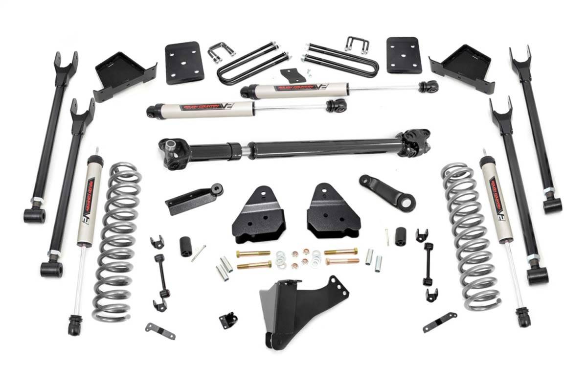 Gain greater travel and improved handling while adding ground clearance and aggressive style with Rough Countrys 4-Link F-250 Lift Kit.This innovative kit allows you to replace your factory arms with a 4-Link setup, using Rough Countrys durable, fixed upper arms and adjustable lower control arms. A set of radius arm drop brackets maintain proper geometry and allow for proper caster setting, which is crucial to maintain factory handling.This kit includes a set of lifted coil springs, radius arm drop-brackets, and ultra-durable, fabricated Anti-wrap rear blocks that prevent binding and axle wrap. This kit also includes stainless steel extended brake lines and brake line brackets to ensure you have everything you need to install your lift. Best of all, this kit features Rough Countrys V2 Monotube Shock Absorbers for the ultimate balance in off-road performance and a smooth highway ride. Includes Rough Countrys Lifetime Replacement Warranty