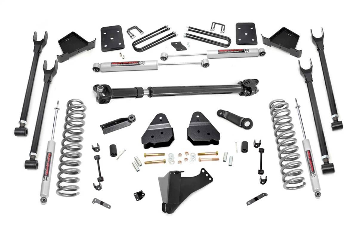 Gain greater travel and improved handling while adding ground clearance and aggressive style with Rough Countrys 4-Link F-250 Lift Kit.This innovative kit allows you to replace your factory arms with a 4-Link setup, using Rough Countrys durable, fixed upper arms and adjustable lower control arms. A set of radius arm drop brackets maintain proper geometry and allow for proper caster setting, which is crucial to maintain factory handling.This kit includes a set of lifted coil springs, radius arm drop-brackets, and ultra-durable, fabricated Anti-wrap rear blocks that prevent binding and axle wrap. This kit also includes stainless steel extended brake lines and brake line brackets to ensure you have everything you need to install your lift. Best of all, this kit features Rough Countrys Nitrogen-Charged N2.0 Shock Absorbers for the ultimate balance in off-road performance and a smooth highway ride. Includes Rough Countrys Lifetime Replacement Warranty
