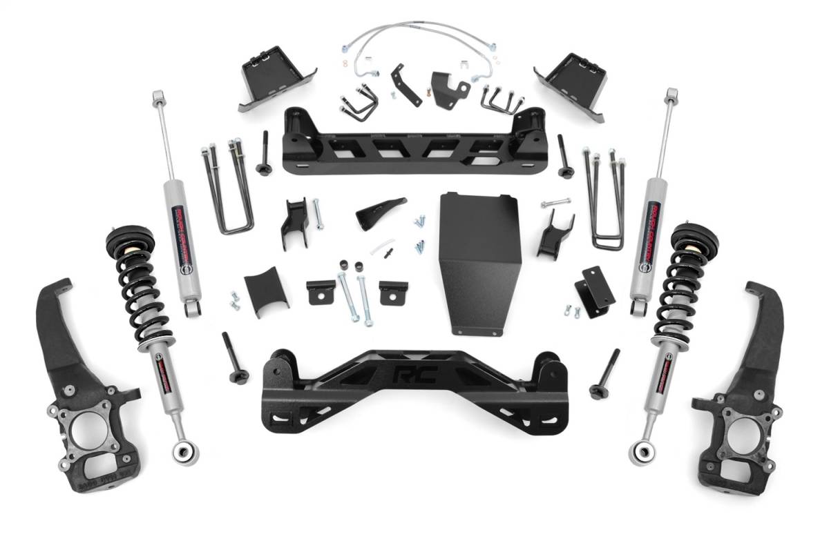Give your 04-08 Ford F-150 an aggressive new look and unparalleled off-road performance with Rough Countrys 6-inch Suspension Lift. This all-inclusive kit features everything needed to take your Ford off the freeway and onto the trails. Featuring a set of durable lifted knuckles and strut spacers, youll gain enough ride height to run up to 35-inch tires with proper wheel backspacing! A set of differential drop brackets, sway-bar drop brackets, brake line brackets, and a drive shaft spacer help keep everything at optimum angles for a factory-like ride, even after lifting. A 1/4-inch thick plate steel front and rear crossmember bring uncompromising strength and good looks to your truck. Our Fabricated Rear Blocks offer considerably more strength than their cast iron counterparts, and were specifically engineered by Rough Country to prevent against axle-wrap. A set of Rough Countrys premium N3 shocks are also included in this kit. These fine tuned 10-stage variable high-pressure Nitrogen charged shocks offer a fantastic blend of off-road action and smooth highway ride quality. With a durable 18mm spring-loaded piston rod and faster-cooling 54mm shock body. Best of all, Rough Countrys 04-08 Ford F-150 Lift Kit is backed by our Lifetime Replacement Warranty.
